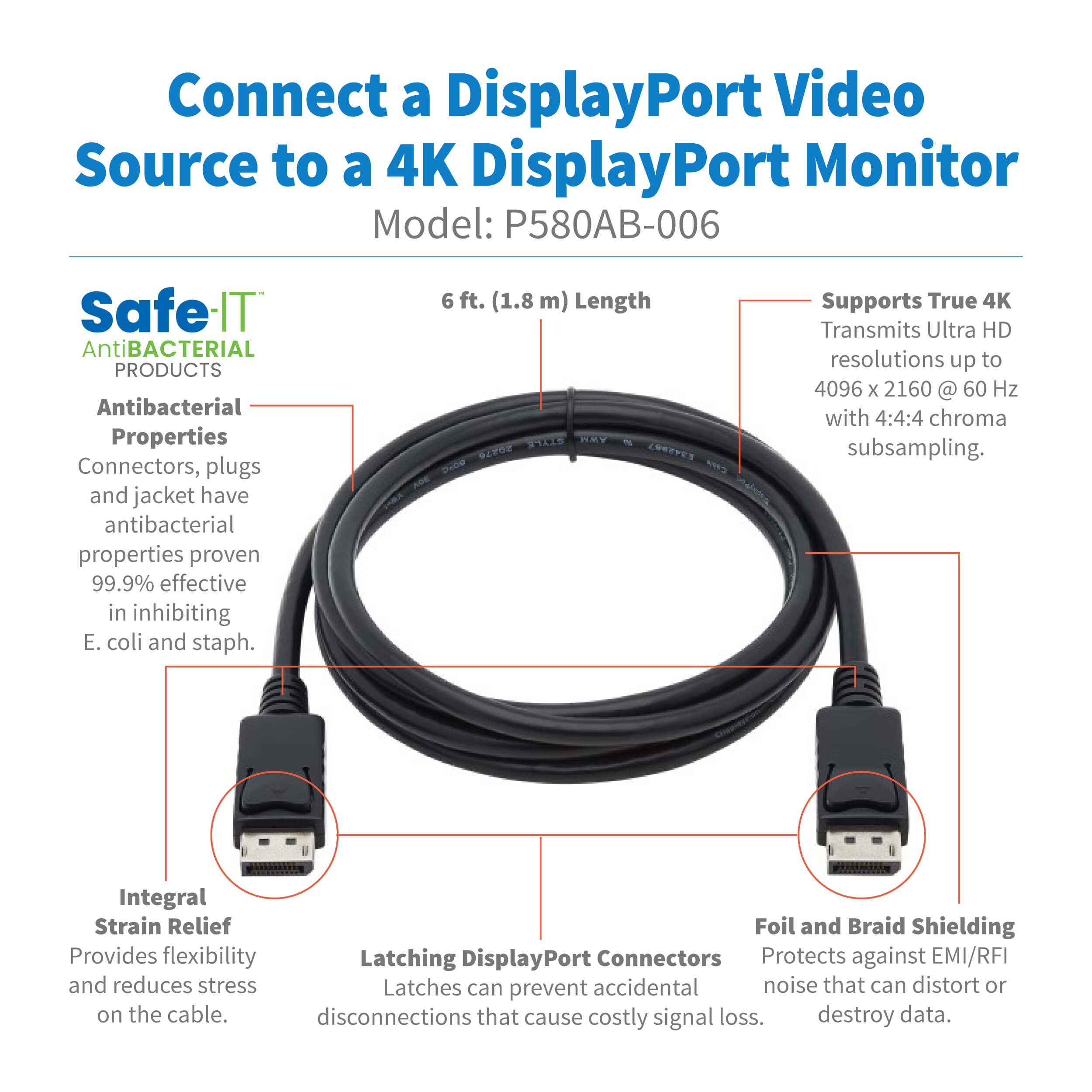 This high-speed DisplayPort cable securely connects laptops, tablets, PCs, Blu-ray players, game consoles, satellite/cable TV receivers and other devices with DisplayPort outputs to HDTVs, HD monitors, projectors or home theater receivers with DisplayPort inputs. The 4K P580AB-006 is backward compatible with all your existing DisplayPort devices.