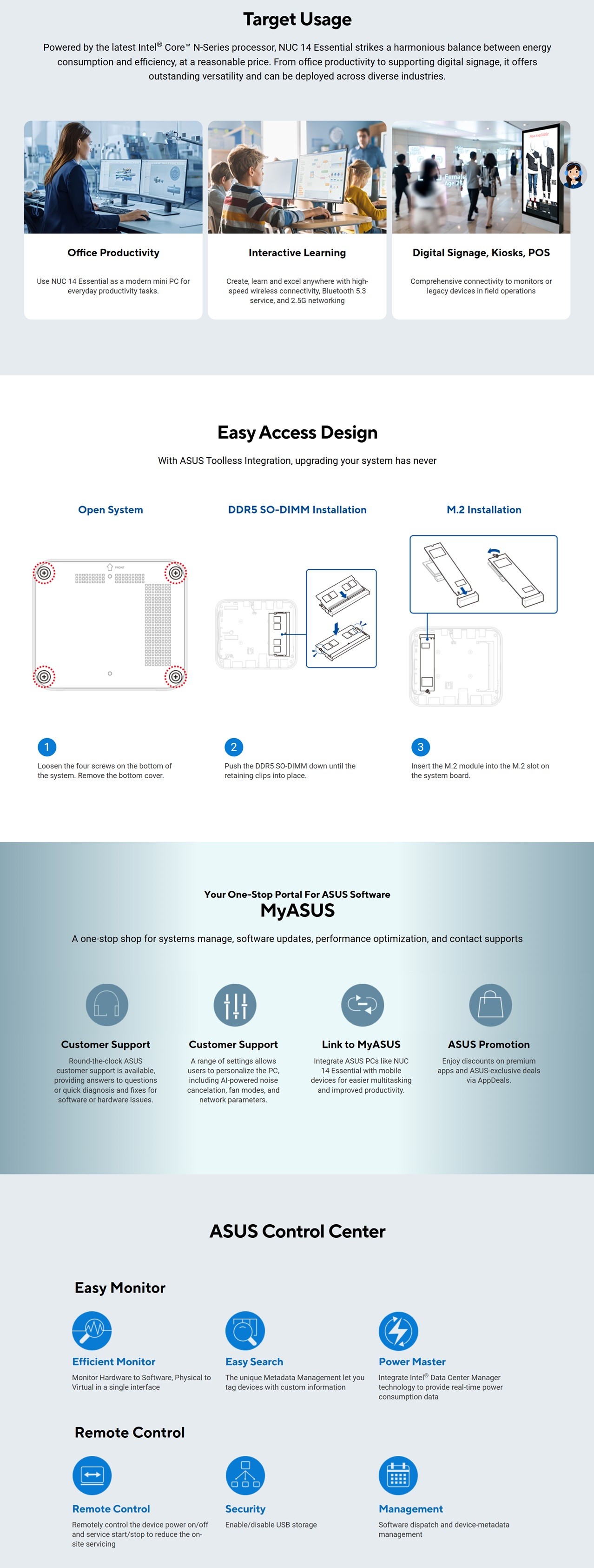NUC 14 Essential offers seamless connectivity with a host of I/O ports on its front and rear panels, supporting up to three 4K displays and offering high-speed networking performance. The front panel features a headset jack, one USB-C ® (10 Gbps ) and a USB Type-A (10 Gbps) port; while the rear includes two USB Type-A (10 Gbps) ports, one USB 2.0, one USB-C with DisplayPort™ (10 Gbps), one DisplayPort, HDMI™, and one LAN port.