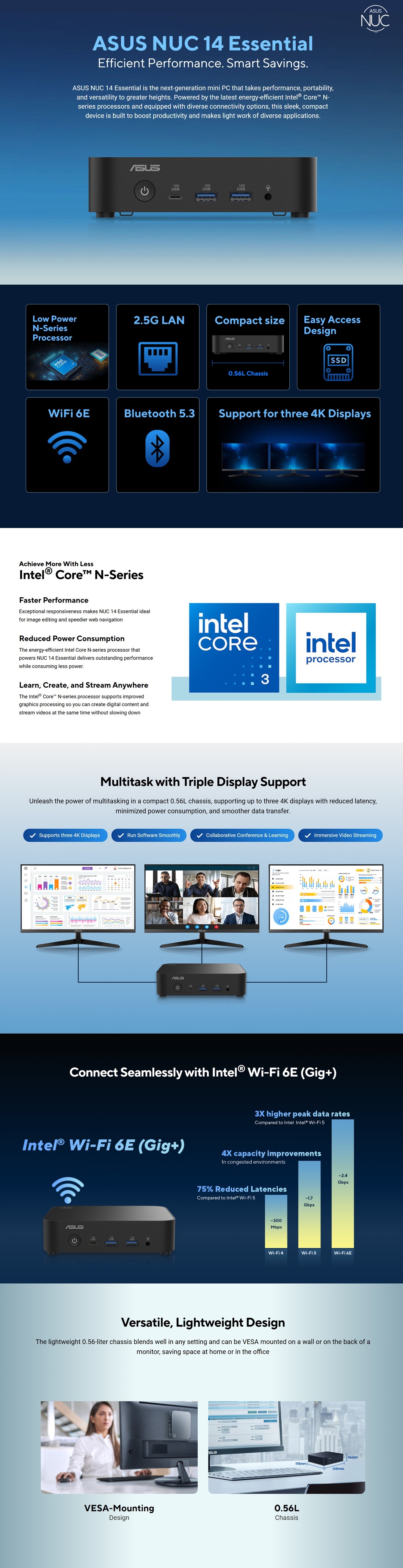 NUC 14 Essential offers seamless connectivity with a host of I/O ports on its front and rear panels, supporting up to three 4K displays and offering high-speed networking performance. The front panel features a headset jack, one USB-C ® (10 Gbps ) and a USB Type-A (10 Gbps) port; while the rear includes two USB Type-A (10 Gbps) ports, one USB 2.0, one USB-C with DisplayPort™ (10 Gbps), one DisplayPort, HDMI™, and one LAN port.