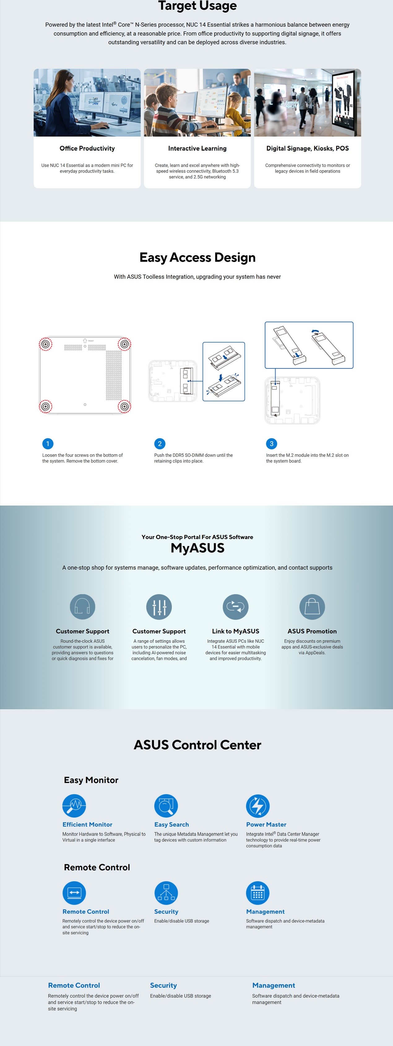 Designed to exceed industry standards, each NUC unit undergoes extensive and rigorous testing to ensure exceptional durability and long-term performance—even in the harshest environments. ASUS NUC is committed to delivering one of the best compact solutions in the world, bringing lasting value to businesses.