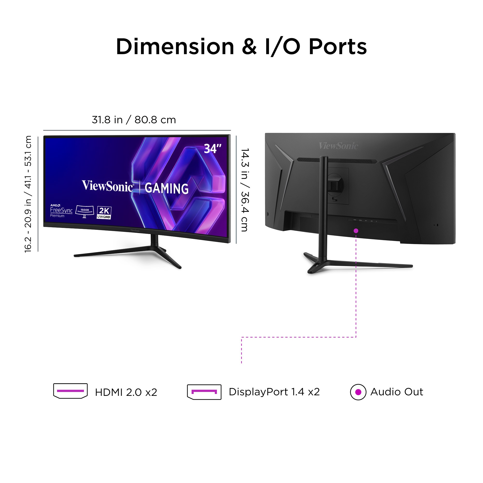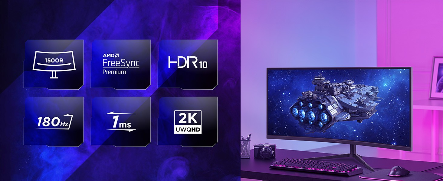 Featuring an immersive 1500R curved screen and stunning WQHD 3440 x 1440 resolution, the 34" ViewSonic® VX3418C-2K monitor is built to level up the way you work and play. With features including a rapid-fire 180 Hz* refresh rate, 1 ms (MPRT) response time and AMD FreeSync™ Premium technology, this monitor virtually eliminates screen tearing and stuttering for a fluid gaming experience. The VX3418C-2K also comes equipped with ViewSonic's exclusive ViewMode™ presets, which offer optimized screen performance for different home entertainment applications such as watching movies, editing files, or playing video games. A 34"" display with a 21:9 aspect ratio delivers more screen space for enhanced multitasking and immersive cinematic experiences alike. Two HDMI (v 2.0) inputs and two DisplayPort (v 1.4) inputs offer flexible connectivity for all of your favorite devices. Plus, with advanced ergonomic features such as swivel, height adjustment, and tilt, this monitor adapts to your preferred setup so you can play for longer in greater comfort. *180Hz refresh rate with DisplayPort only.