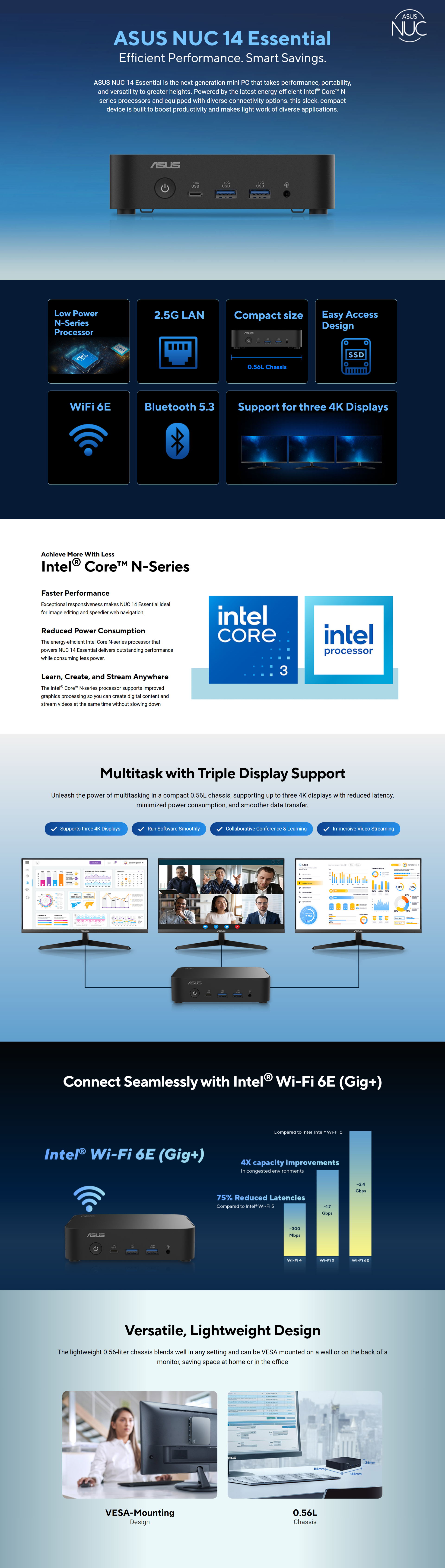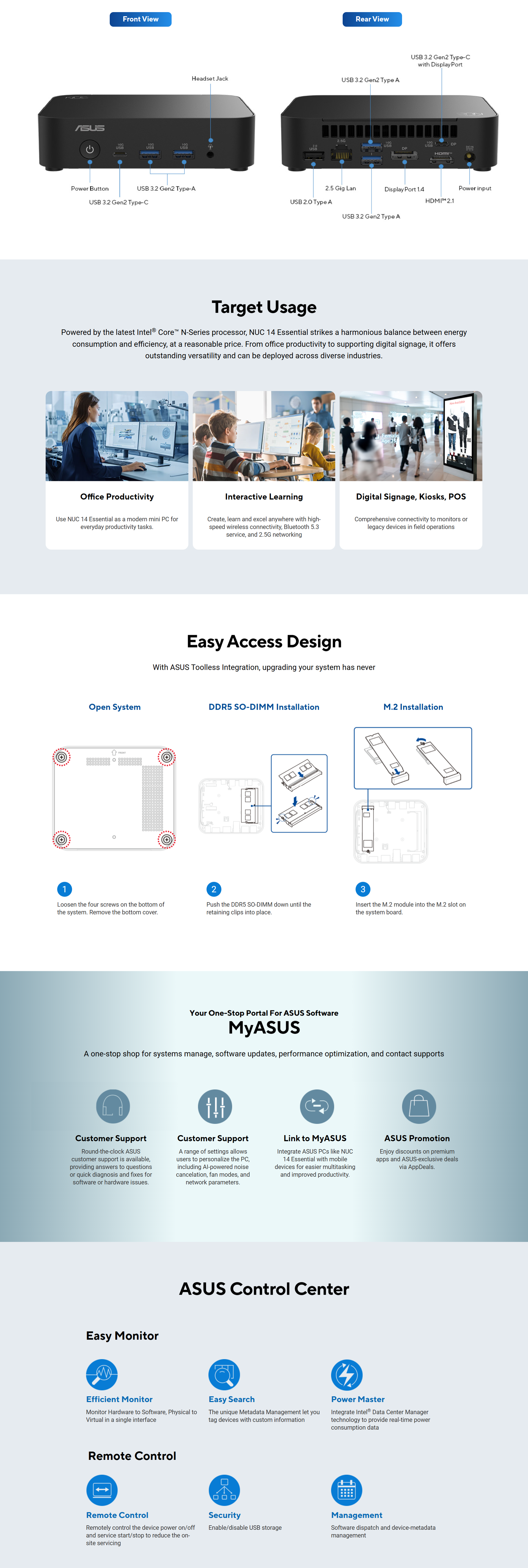 NUC 14 Essential offers seamless connectivity with a host of I/O ports on its front and rear panels, supporting up to three 4K displays and offering high-speed networking performance. The front panel features a headset jack, one USB-C ® (10 Gbps ) and a USB Type-A (10 Gbps) port; while the rear includes two USB Type-A (10 Gbps) ports, one USB 2.0, one USB-C with DisplayPort™ (10 Gbps), one DisplayPort, HDMI™, and one LAN port.