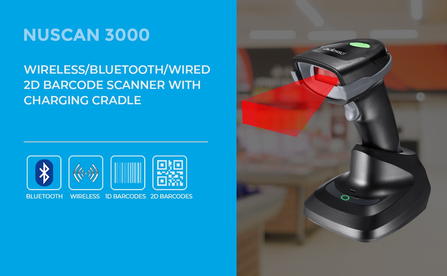 This barcode scanner offers versatile connectivity with Bluetooth, 2.4GHz wireless, and wired USB options.