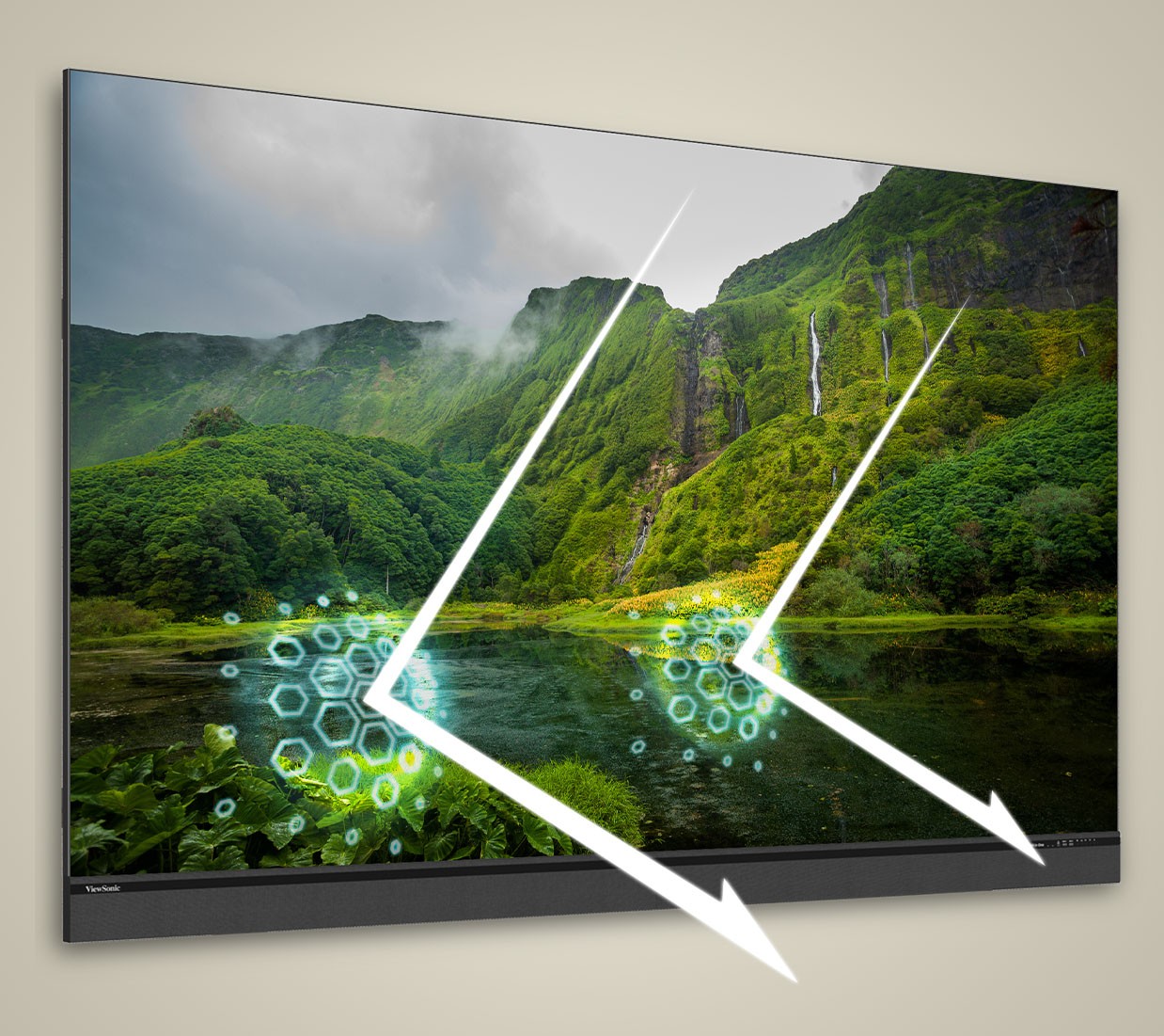 The display features sloped dual 30W speakers, designed to direct sound more effectively towards the listener’s ears. This innovative design enhances audio clarity and power, ensuring a more immersive and dynamic auditory experience. Whether in a large auditorium or meeting room, it delivers rich, impactful sound for every presentation.