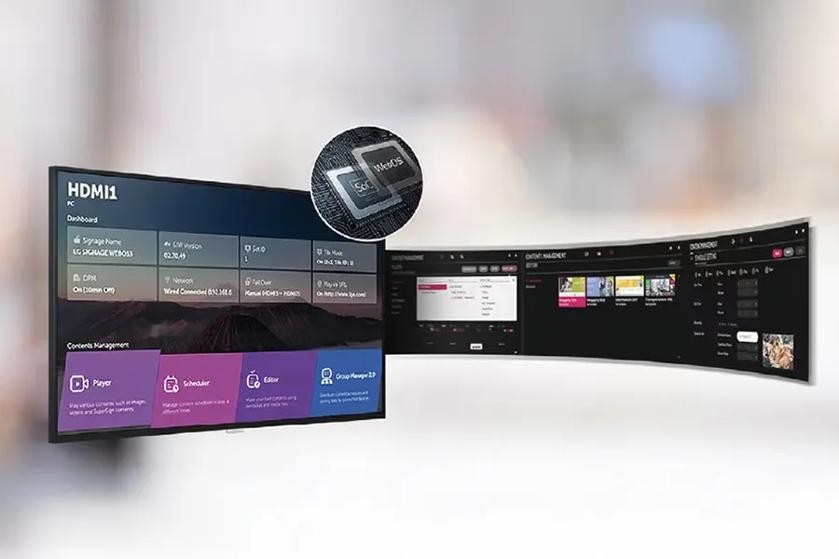 SuperSign Control is the essential control software, and it can manage up to 100 displays through a single account and server. You can remotely adjust power, volume, and scheduling, and firmware updates supported. LG SuperSign Control sold separately.