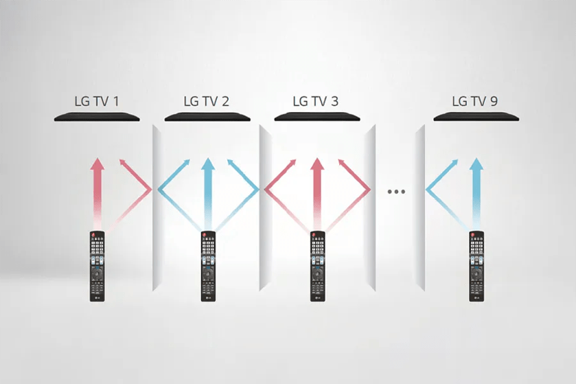 Multi IR* function eliminates the signal interference of remote controls that occurs between multiple TVs in one place. LG hospital TV supports this when used with the Multi-IR remote control, so users can freely control their own TVs without disturbing the others.
