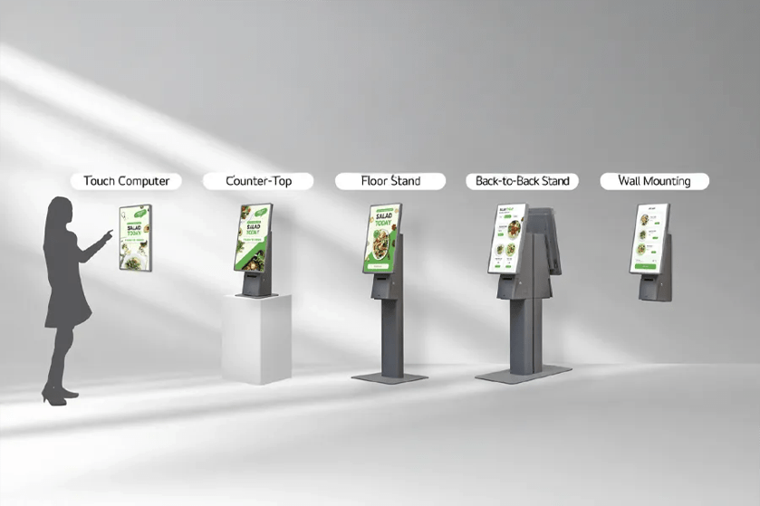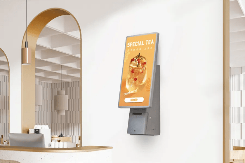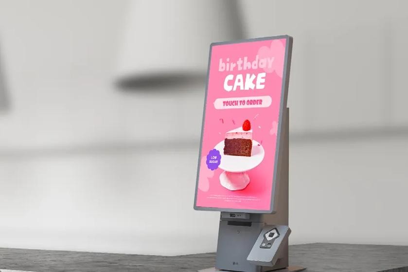 The 27-inch kiosk screen features Advanced In-cell Touch (AIT) technology, improving content visibility by removing layers in the touchscreen that reduces reflections in bright indoor settings and offers a brightness level of 300 nits.