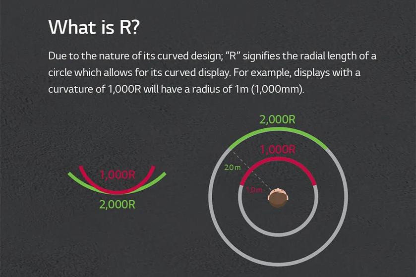 Due to the nature of its curved design; "R" signifies the radial length of a circle which allows for its curved display. For example, displays with a curvature of 1,000R will have a radius of 1m.