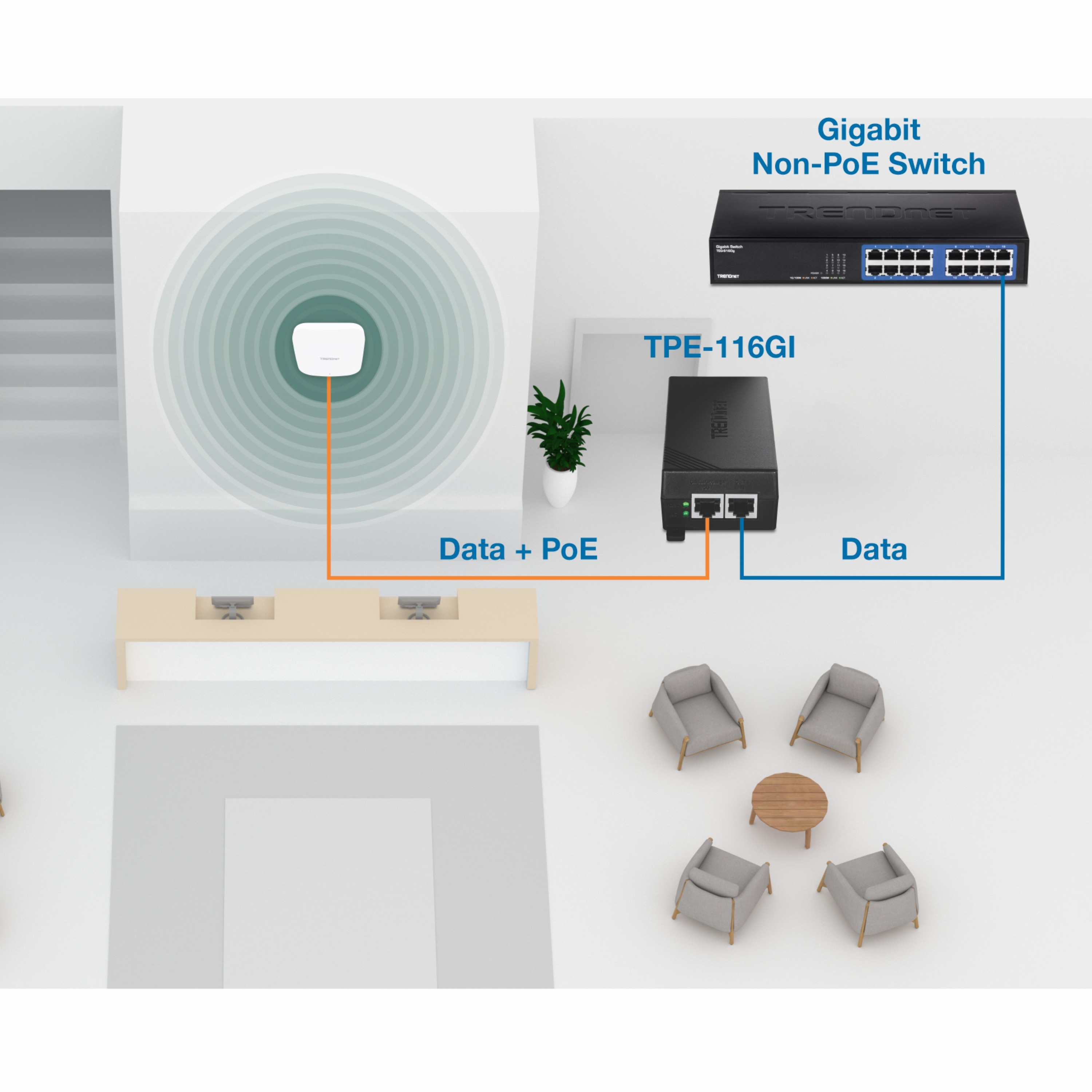 non-PoE gigabit switch and run an Ethernet cable with data + power to network a PoE device up to 100 meters (328 ft.) away.