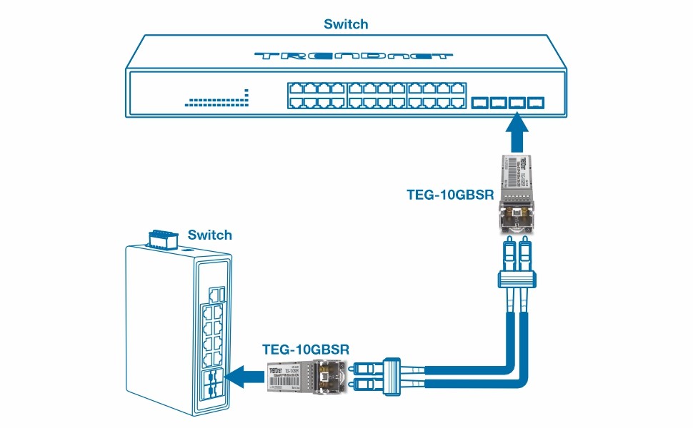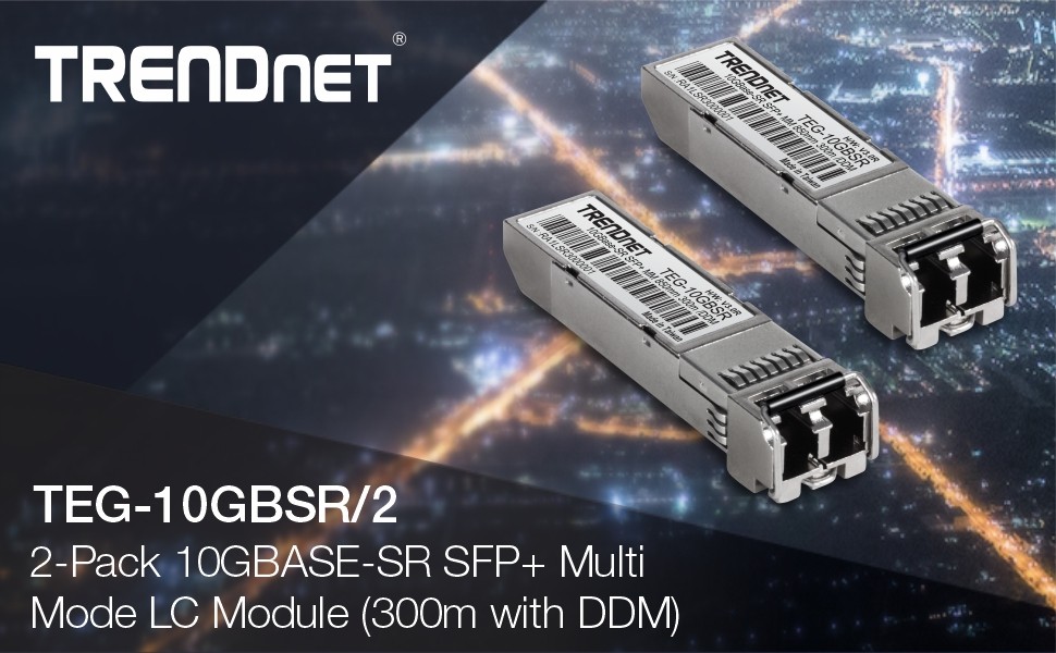 TRENDnet’s hot-pluggable 2-Pack 10GBASE-SR SFP+ Multi Mode LC Module, model TEG-10GBSR/2, works with an MSA compliant SFP+ port. This Multi Mode transceiver spans distances up to 300m (984 ft.), comes with a LC duplex connector, and supports up to 10.5 Gbps networking throughput speeds. Digital Diagnostics Monitoring (DDM) captures critical device parameters, such as transmit/receive power, temperature, and voltage