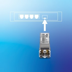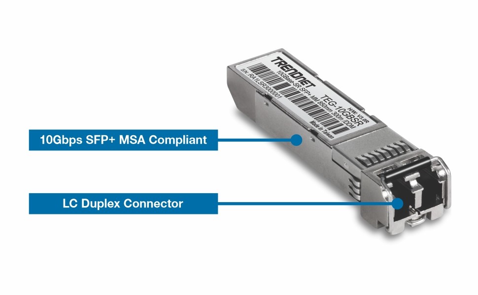 Hot-pluggable SFP+ transceiver works with an MSA compliant SFP+ port