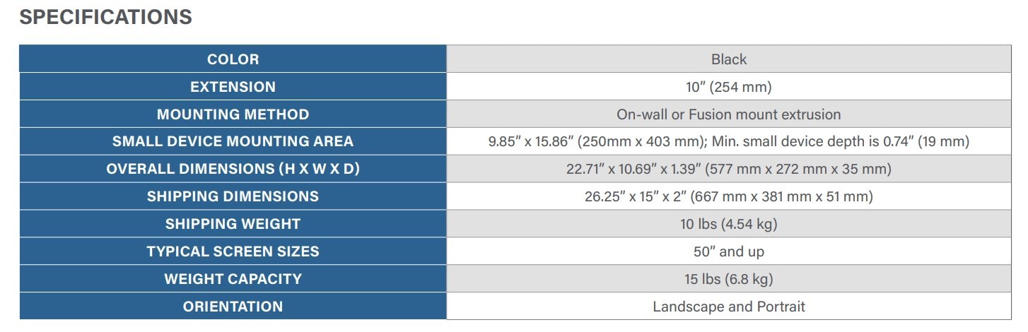 The Proximity® Component Storage Slide-Lock Panel facilitates easy, concealed mounting of AV equipment behind displays. To simplify service and accessibility to the equipment simply slide the storage panel out. Install on wall or attach to Fusion® mounts* left, right, or below the display. The built-in and tool-free 15” x 10” Lever Lock™ plate is easily removed and replaced from the slide-lock panel to service the equipment post installation without touching the display. With 15 lbs. (6.8 kg) weight capacity, this storage panel will hold most popular small devices for AV installations.