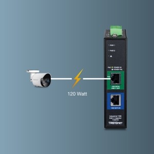 This industrial 10G PoE++ injector supplies up to 120W of power to a PoE devices.