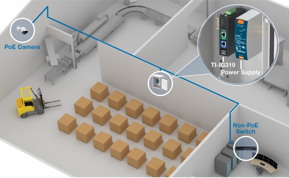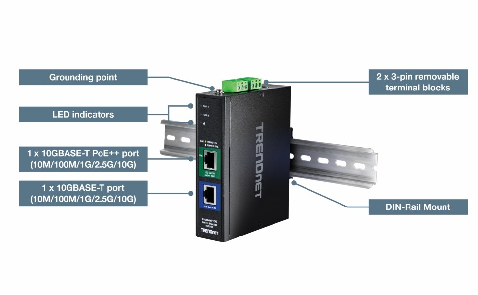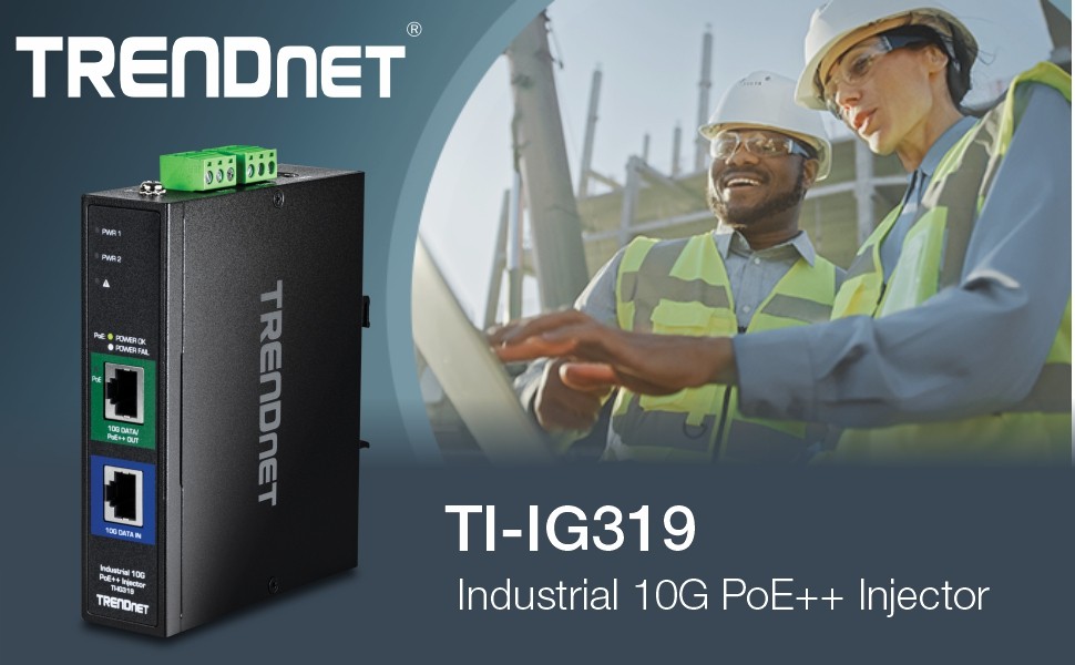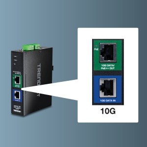 TRENDnet’s Industrial 10G PoE++ Injector, model TI-IG319, allows users to add PoE++ power to a non-PoE switch. Connect the 10G PoE++ injector to a non-PoE switch, and then run an Ethernet cable up to 100 meters (328 ft.) to network a PoE/PoE+/PoE++ device. This multi-gig industrial PoE++ injector supplies up to 120W of power to PoE devices. The fanless design conveniently eliminates operating noise and lowers energy consumption. The industrial 10G injector is equipped with an IP50 rated metal enclosure, designed to withstand a high degree of vibration and shock, while operating within a temperature range of -40° – 75° C (-40° – 16758° F) for extreme industrial environments.