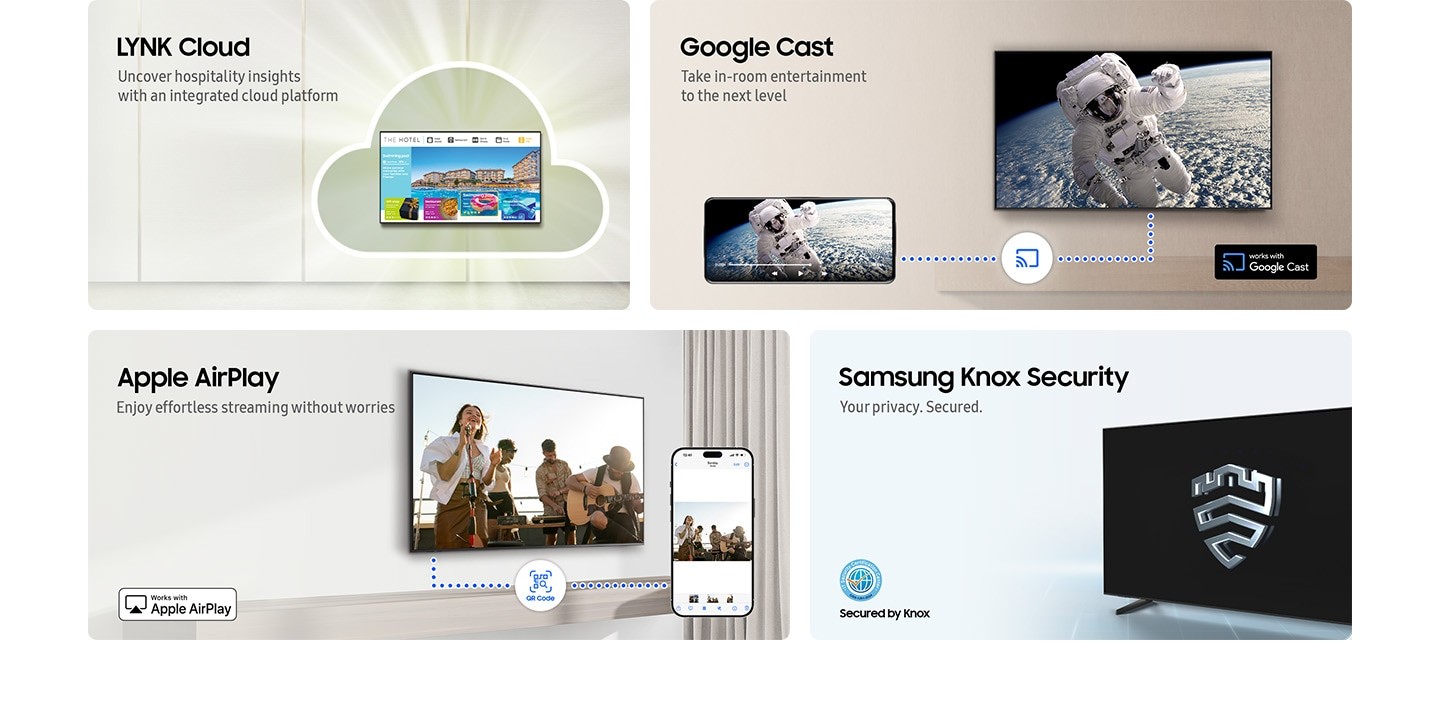 With Google Castâ„¢, guests can easily cast their favorite content directly from their Androidâ„¢ and iOS devices to the TV, eliminating the need for additional dongles or login requirements. The connection process is quick and straight forward, utilizing QR codes for instant pairing.