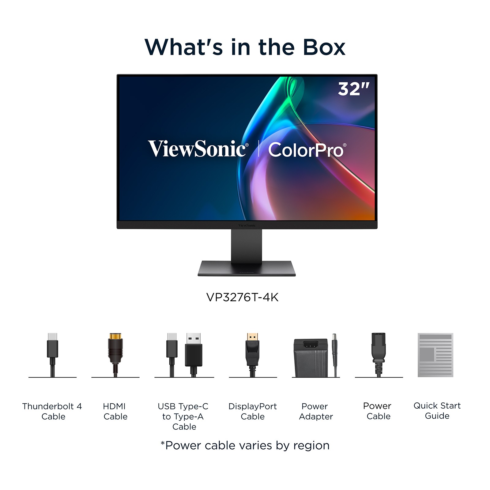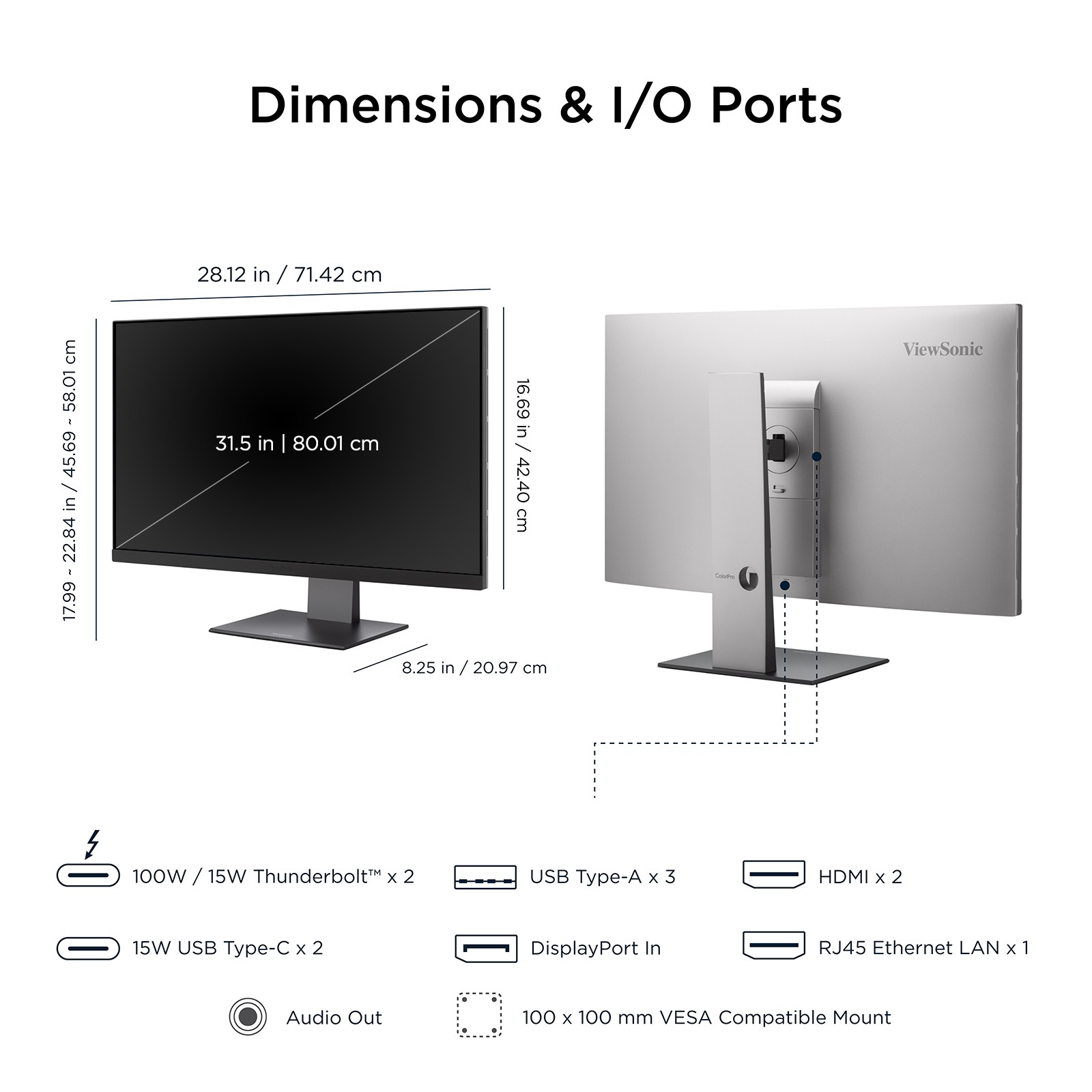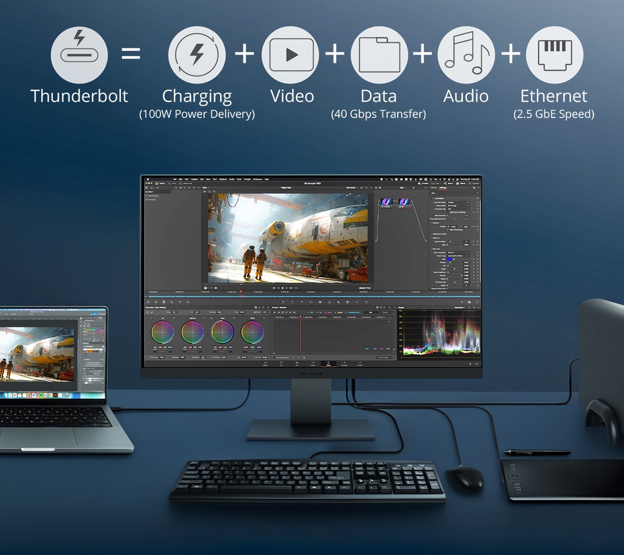 The VP3276T-4K ColorPro™ Monitor is a professional-grade display engineered for creative excellence, offering stunning 4K resolution, precise DCI-P3 color accuracy, and HDR400 for an immersive visual experience. With integrated docking monitor features, including Thunderbolt 4 with 100W of power delivery, RJ45 Ethernet, and multiple connectivity options such as DisplayPort, HDMI, and a USB hub, it simplifies your workspace while ensuring stable performance. Thunderbolt technology allows this monitor to support dual 4K daisy chaining, allowing you to extend your display setup seamlessly for enhanced productivity.