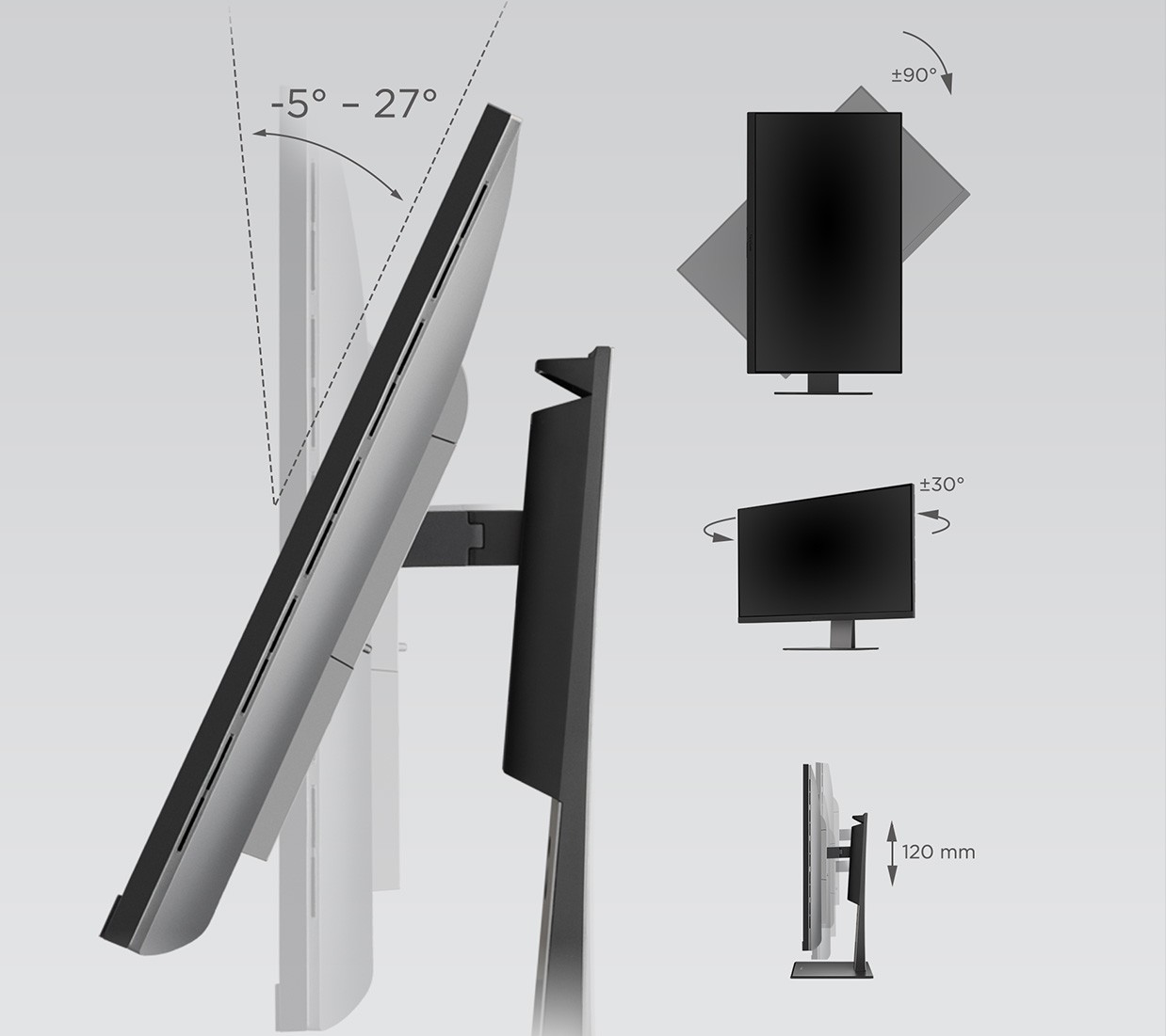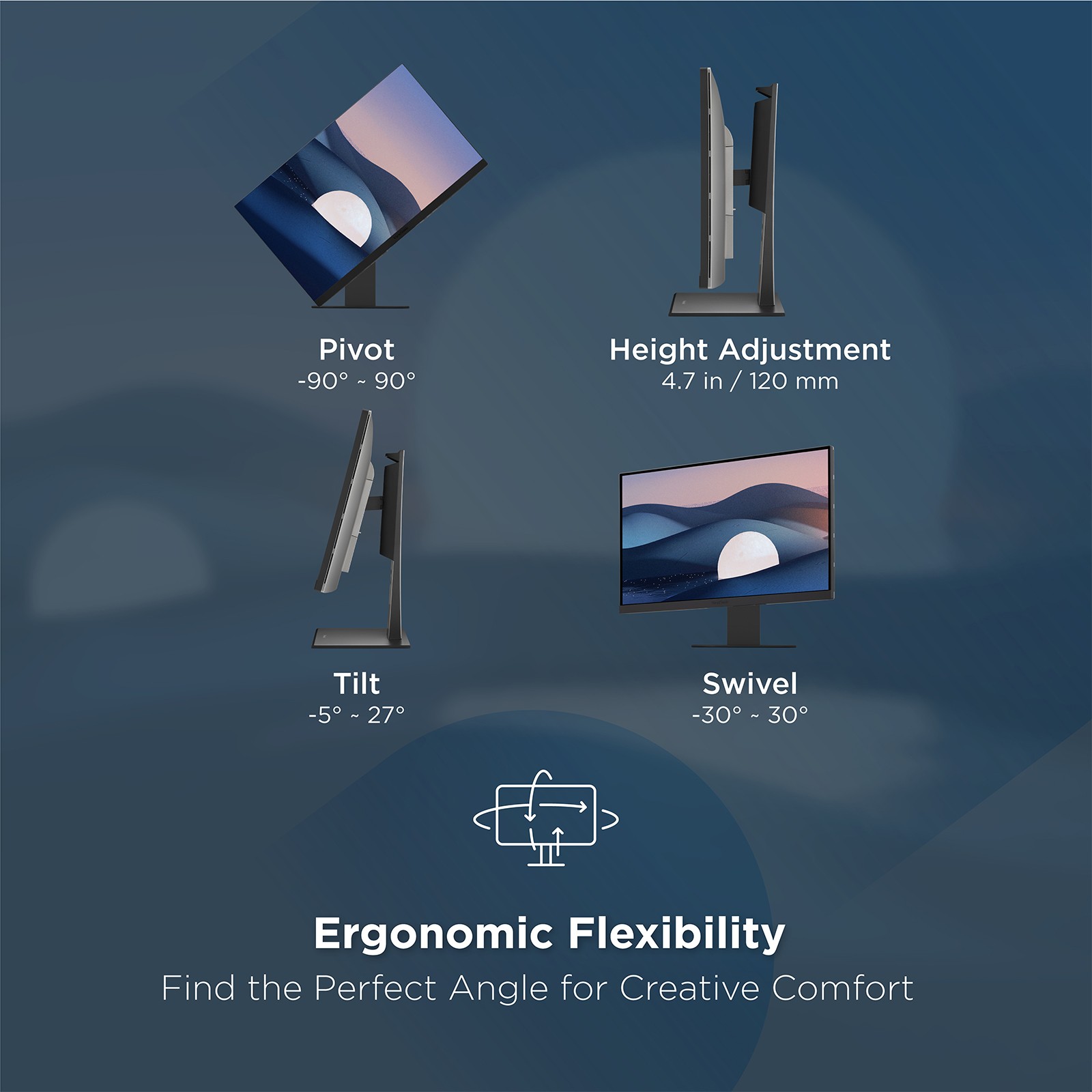 Experience optimal comfort and productivity with a sleek metal design. Adjust the monitor's height, tilt, swivel, and pivot to find an ideal viewing angle that can help reduce strain on your eyes, neck, and back. The ergonomic design promotes better posture and allows you to work efficiently for extended periods.