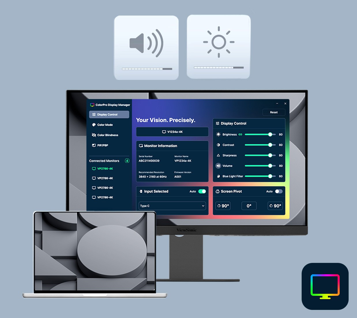 Using a Mac with a ViewSonic monitor is simple. With ColorPro Display Manager you can adjust brightness and volume using your Mac function keys. Need more control? Open the onscreen menu to personalize settings like ViewMode and other display options to match how you work or create.