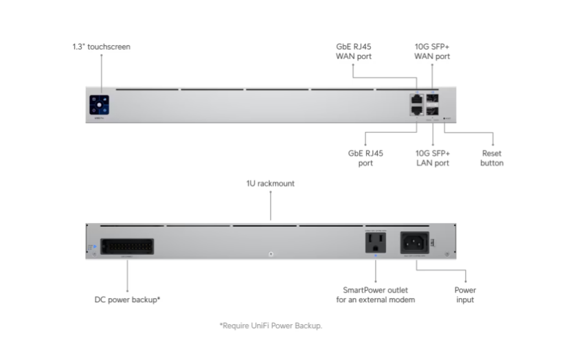 10G multi-WAN independent gateway with UniFi Power Backup support designed to protect large-scale networks.