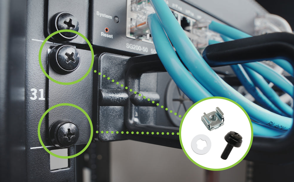 Securely mount each hook to your server rack with just two screws on each side. (included)