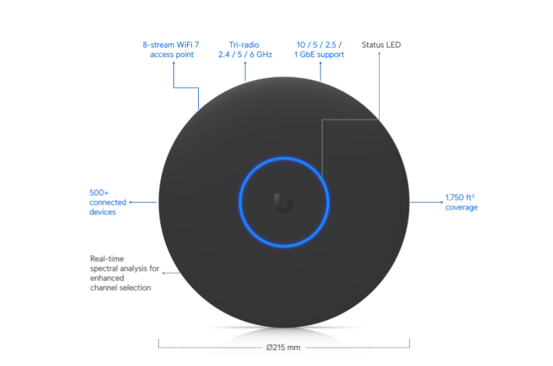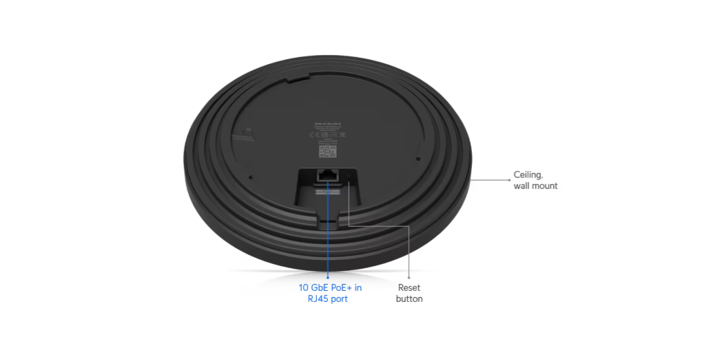 Ceiling-mounted 8-stream WiFi 7 AP with dedicated spectral scanning radio and 10/5/2.5/1 GbE support.