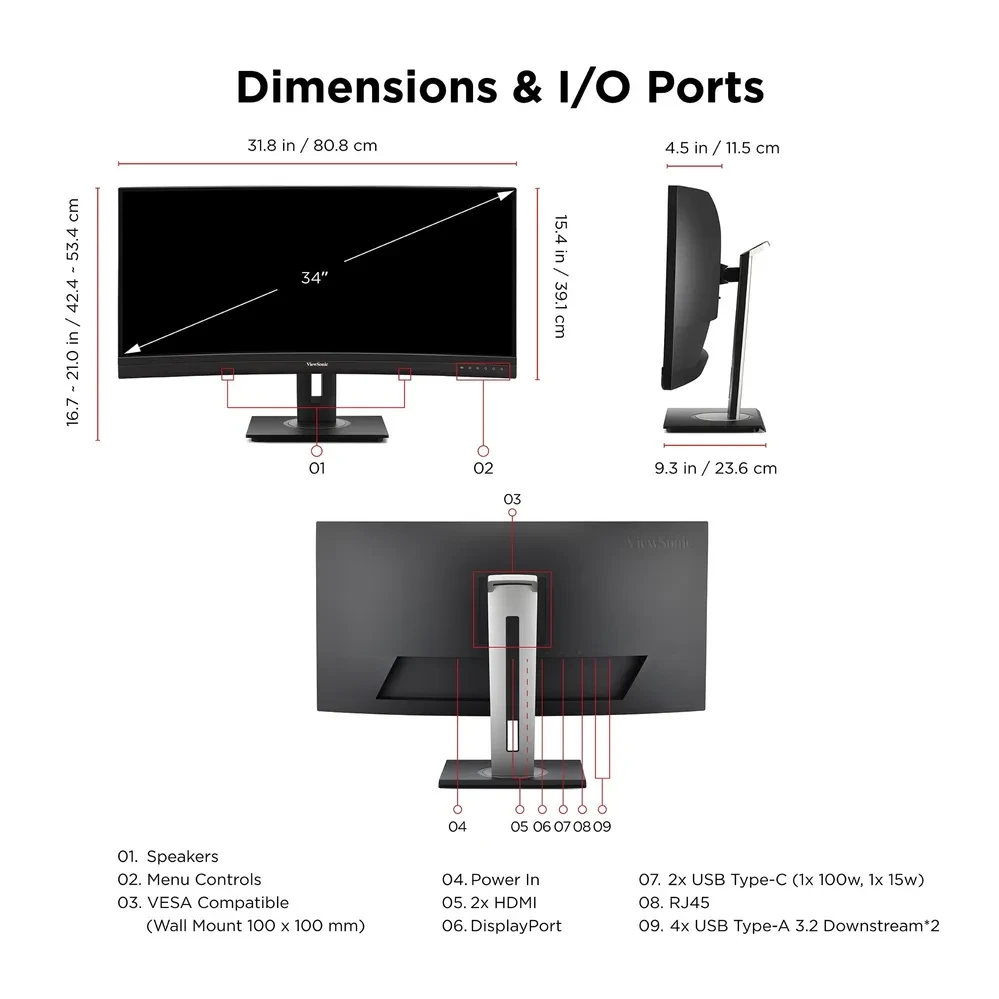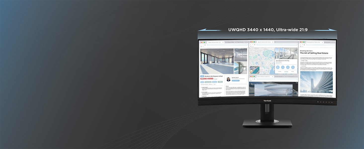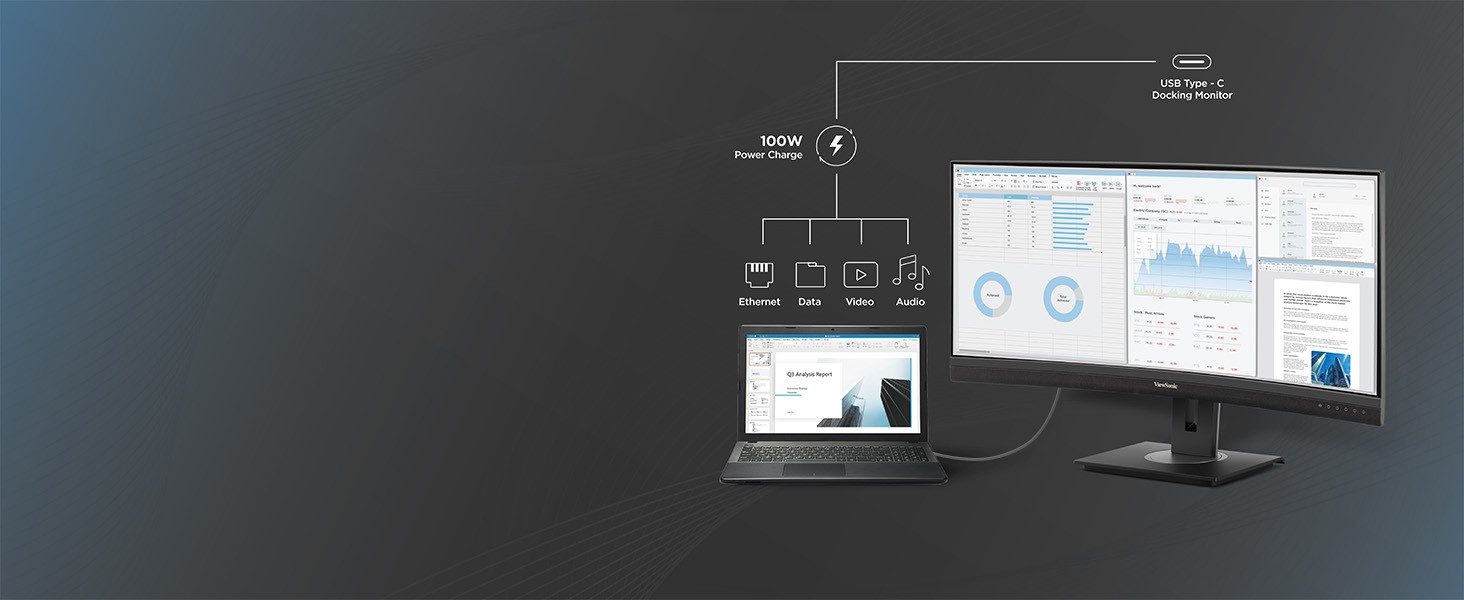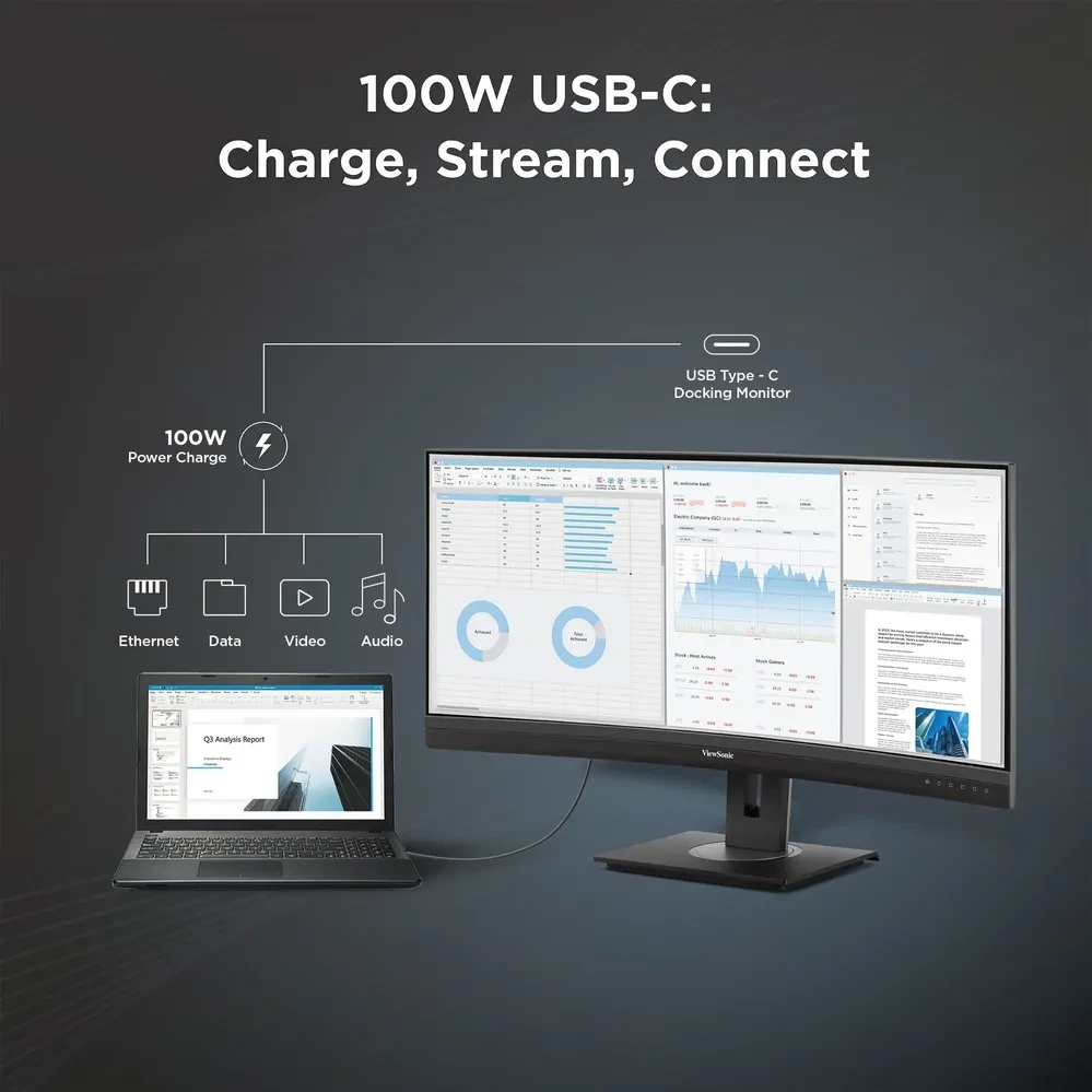 Streamline your setup and see the bigger picture with the ViewSonic ® VG3456CA USB-C docking monitor. Save hundreds with a built-in docking station that includes USB-C connectivity with 100W power delivery, an RJ45 Ethernet port, and an integrated USB hub that makes it easy to connect the latest laptops and systems. This 34" curved ultrawide monitor offers expansive screen space with a UWQHD 3440x1440 resolution. Its 21:9 aspect ratio provides additional workspace, allowing you to display more content simultaneously - without the bezel gap that can be typically found in dual-monitor setups. The immersive 1500R curvature enhances viewing comfort and reduces eye strain by mimicking the natural curvature of the human eye. Elevate your productivity and unlock more screen space with the VG3456CA USB-C monitor today.