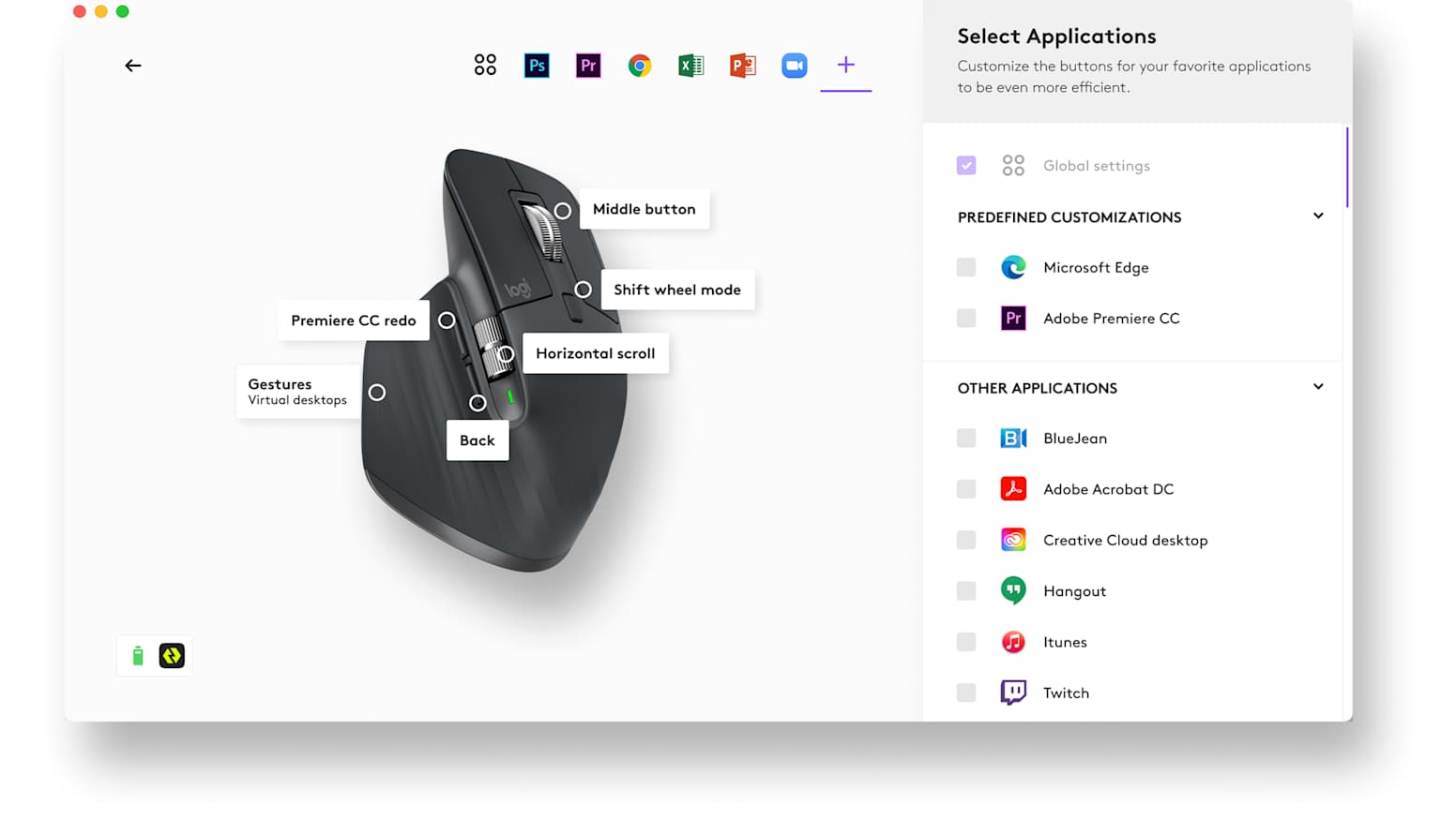 MX Master 3S is fully customizable in virtually every app you use with Logi Options+. You’ll work faster with predefined customizations optimized for your favorite apps such as Adobe Photoshop, Adobe Premiere Pro, Final Cut Pro, Google Chrome, Safari, Zoom, and Microsoft Teams, Word, Excel, PowerPoint, and Edge.