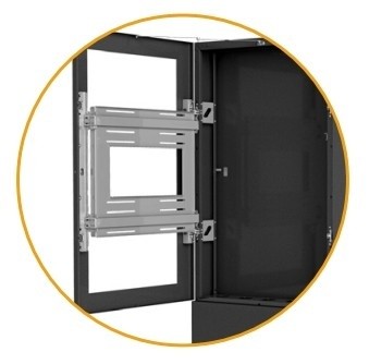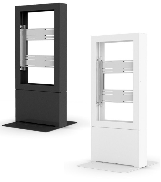 Impact™ Floor Mounted Portrait Kiosks provide an aesthetic solution for enclosing displays in open areas. Designed with no exposed fasteners while maintaining full access and serviceability. Our exclusive design keeps the display mounted to the frame when opened. Keyed locking security keeps displays safe, and a universal AV Storage plate holds supporting equipment.