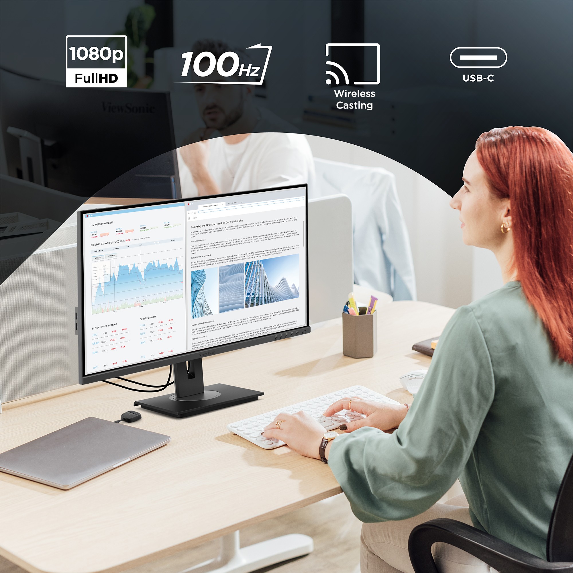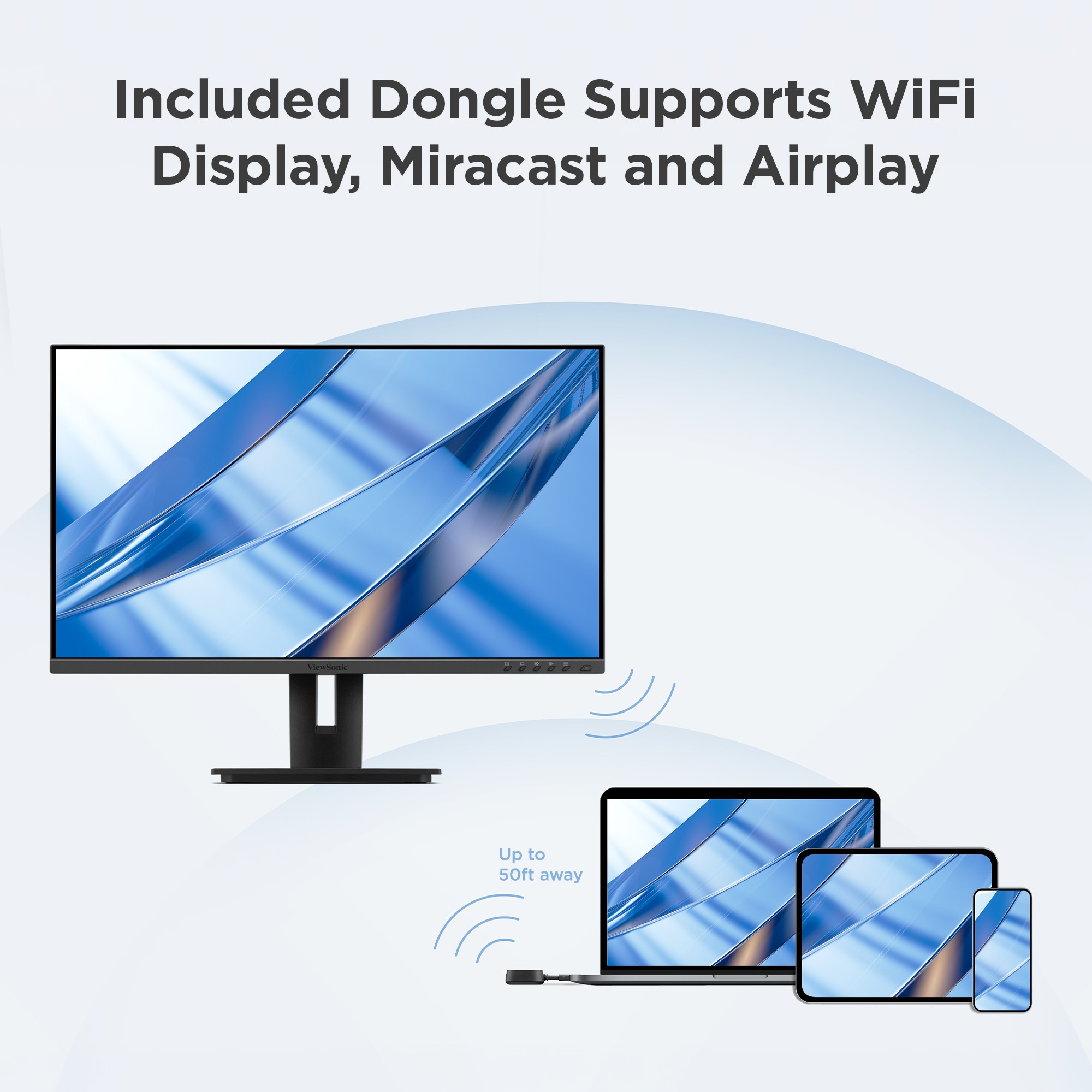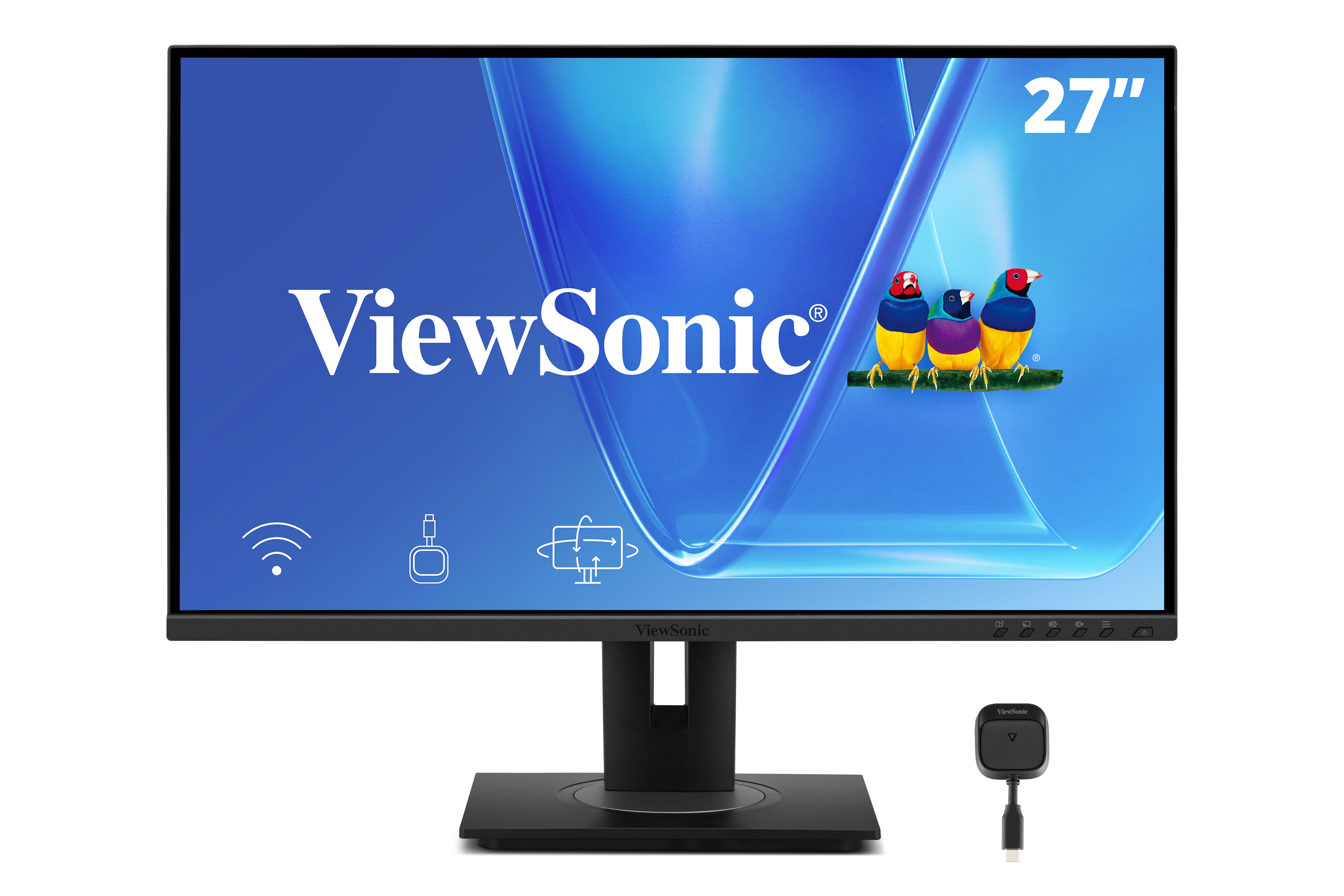 Transform any desk into a high powered workstation with the ViewSonic VG2748N monitor. Enjoy seamless connectivity and a streamlined, cable-free workspace using the included ViewShare dongle. This 27-inch Full HD IPS monitor works with WiFi Display, Miracast, and AirPlay through the dongle, allowing easy content sharing from compatible devices. The WiFi-enabled dongle also supports up to 65W USB-C power delivery when connected to a power source, helping keep laptops charged without extra cables. When a wired connection is preferred or required, the VG2748N includes HDMI, DisplayPort, and VGA inputs, along with a built in USB hub for accessories. An advanced ergonomic stand supports tilt, swivel, pivot, and height adjustment for all day comfort. Eco-friendly packaging and a low blue light solution round out a monitor designed for modern work environments.