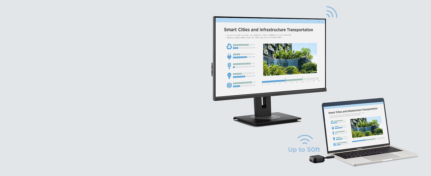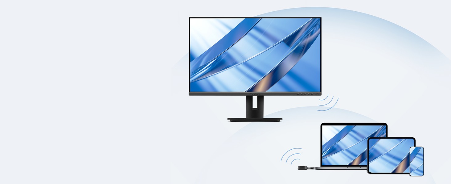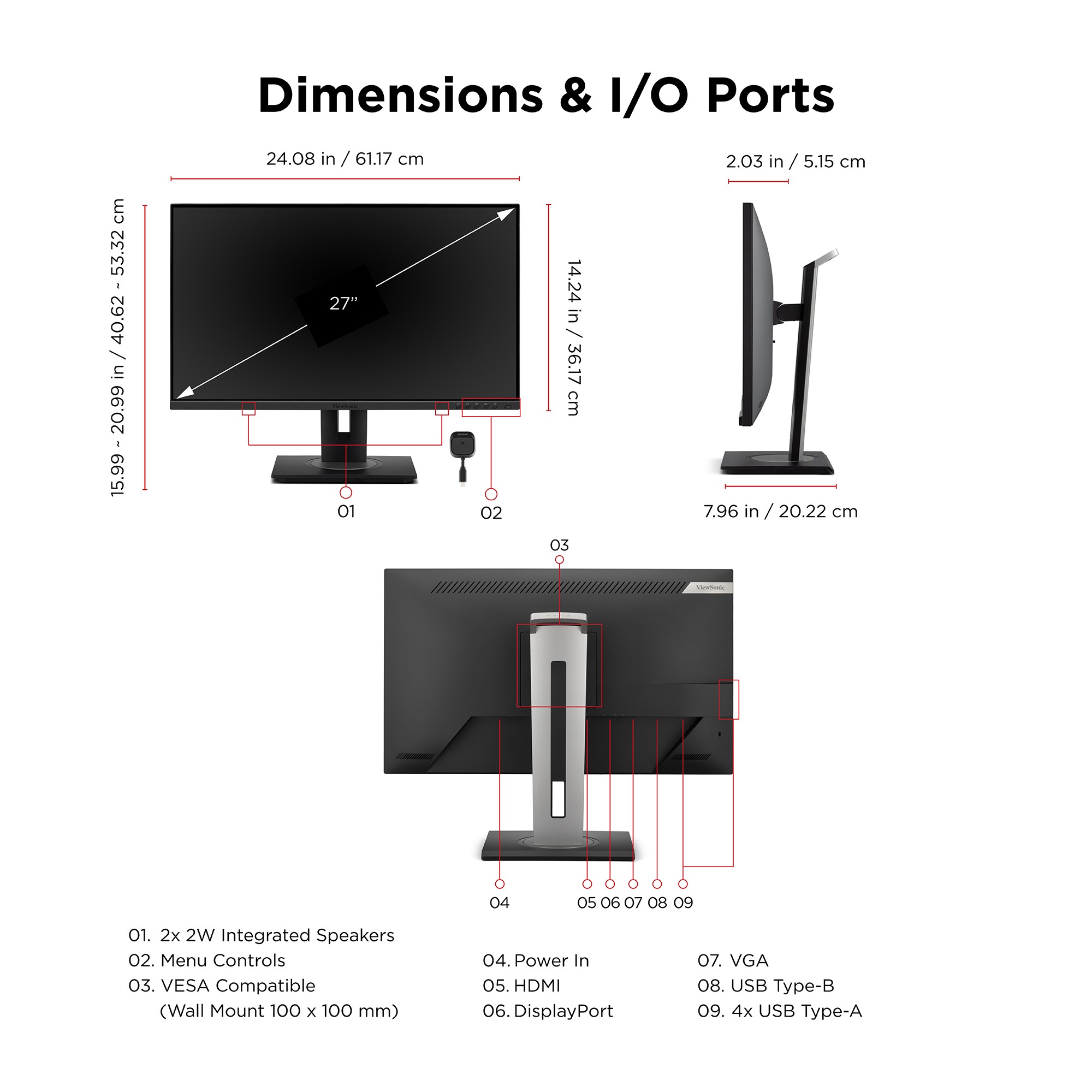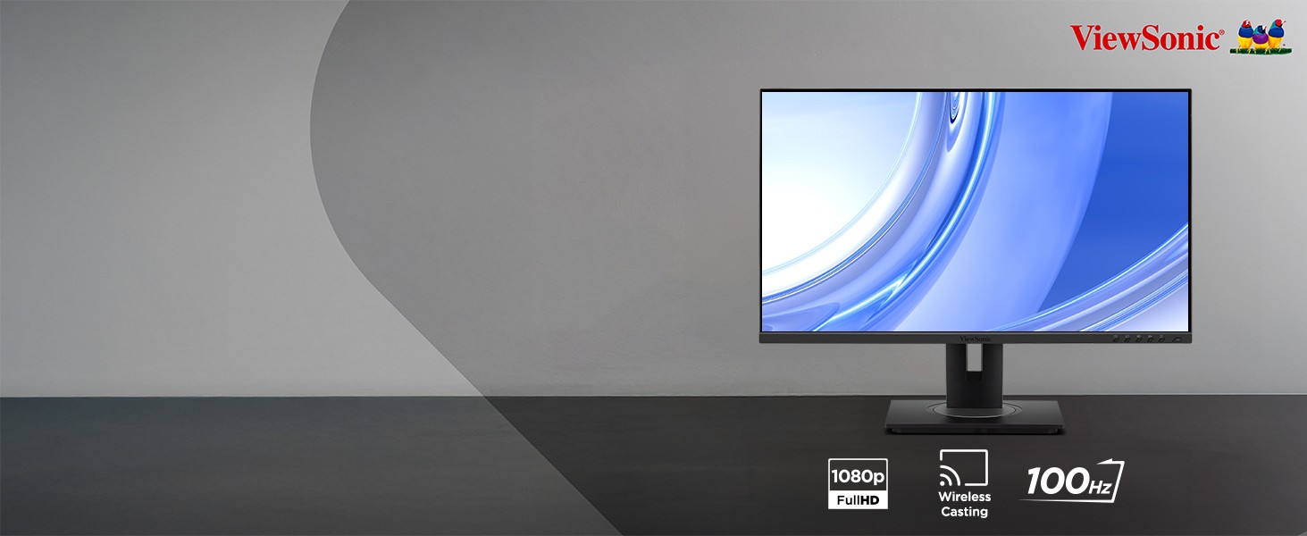 Transform any desk into a high powered workstation with the ViewSonic VG2748N monitor. Enjoy seamless connectivity and a streamlined, cable-free workspace using the included ViewShare dongle. This 27-inch Full HD IPS monitor works with WiFi Display, Miracast, and AirPlay through the dongle, allowing easy content sharing from compatible devices. The WiFi-enabled dongle also supports up to 65W USB-C power delivery when connected to a power source, helping keep laptops charged without extra cables. When a wired connection is preferred or required, the VG2748N includes HDMI, DisplayPort, and VGA inputs, along with a built in USB hub for accessories. An advanced ergonomic stand supports tilt, swivel, pivot, and height adjustment for all day comfort. Eco-friendly packaging and a low blue light solution round out a monitor designed for modern work environments.
