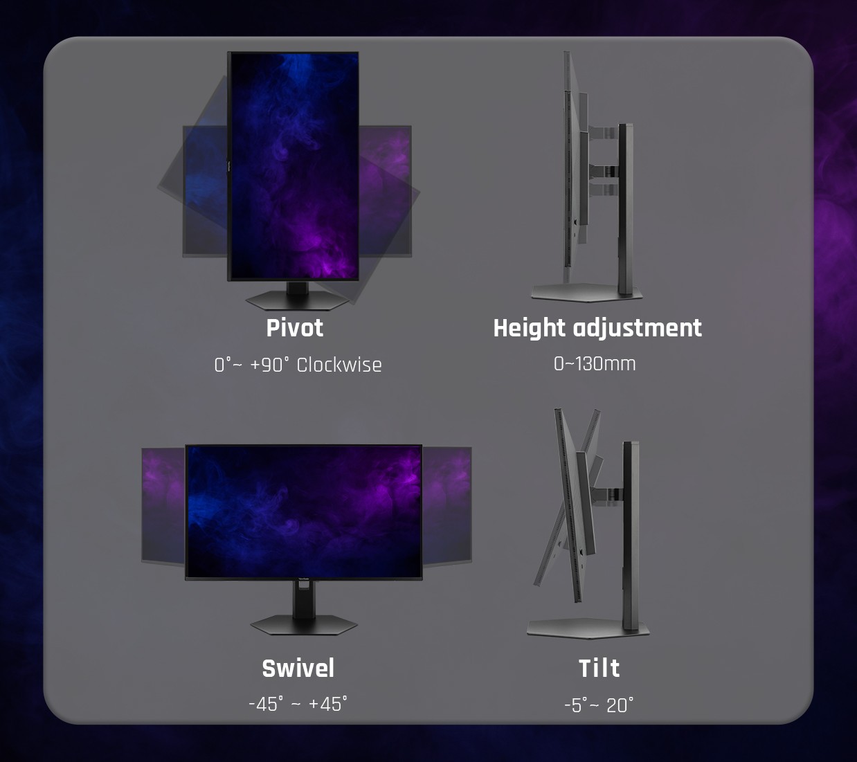 This monitor features a fully adjustable ergonomic stand capable of considerable swivel, pivot, tilt, and height adjustment. The stand is also designed with a cable management feature that helps reduce clutter around your gaming space.