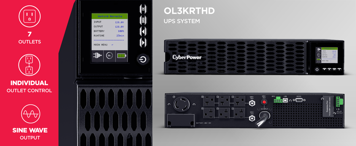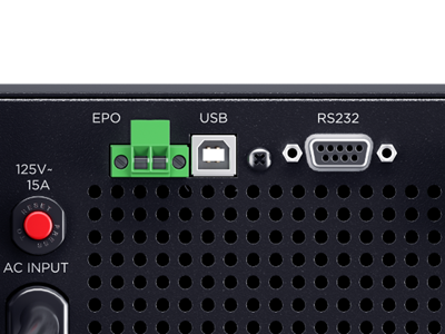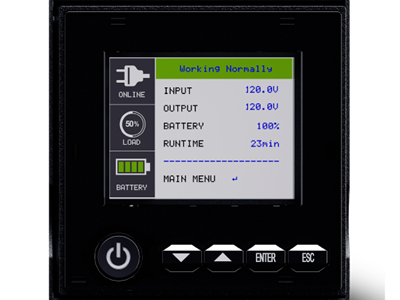 The auto-rotating, multi-function color LCD shows the UPS status: green is normal, yellow is a warning, red is a power failure, or fault notices. It provides UPS controls, event logs, and diagnostics.