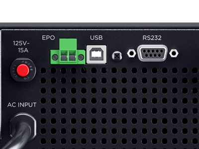 The auto-rotating, multi-function color LCD shows the UPS status: green is normal, yellow is a warning, red is a power failure, or fault notices. It provides UPS controls, event logs, and diagnostics.