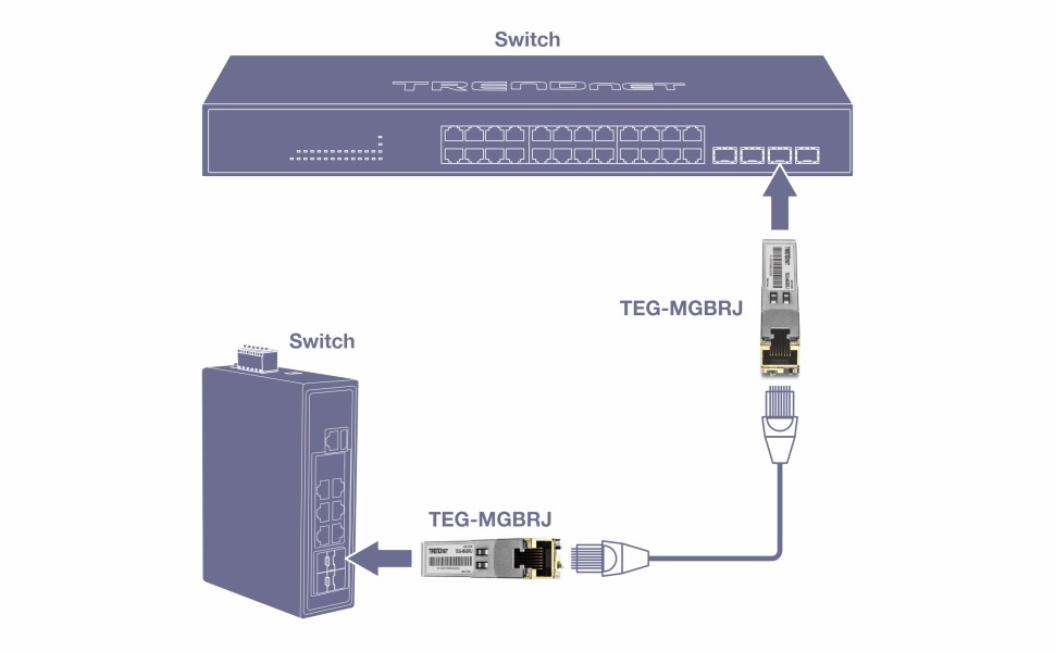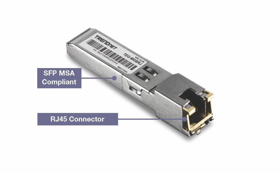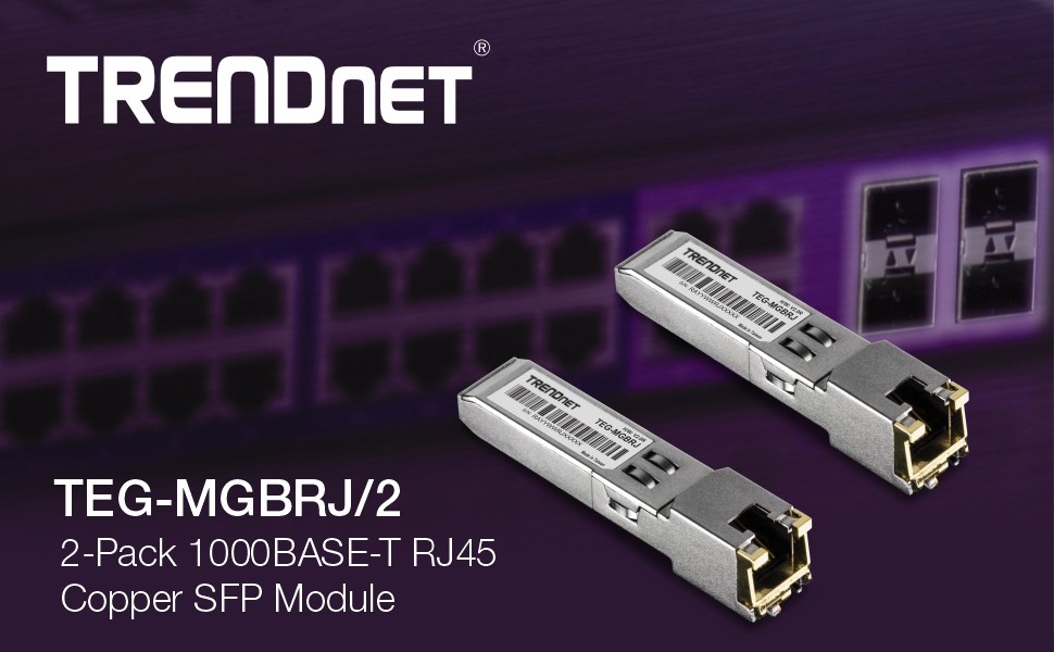 TRENDnet’s 2-Pack 1000BASE-T RJ45 Copper SFP Module, model TEG-MGBRJ/2, converts a standard SFP port into a RJ45 gigabit port for additional copper connectivity. These SFP modules work with standard SFP ports commonly found in network switches and fiber media converters. Save on equipment costs by repurposing a switch’s unused SFP ports for copper connectivity.