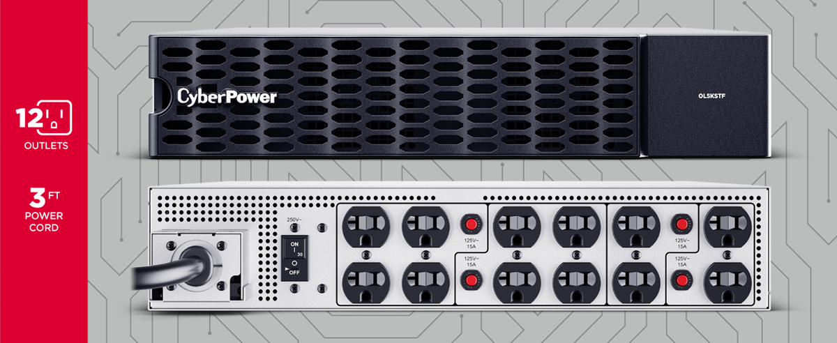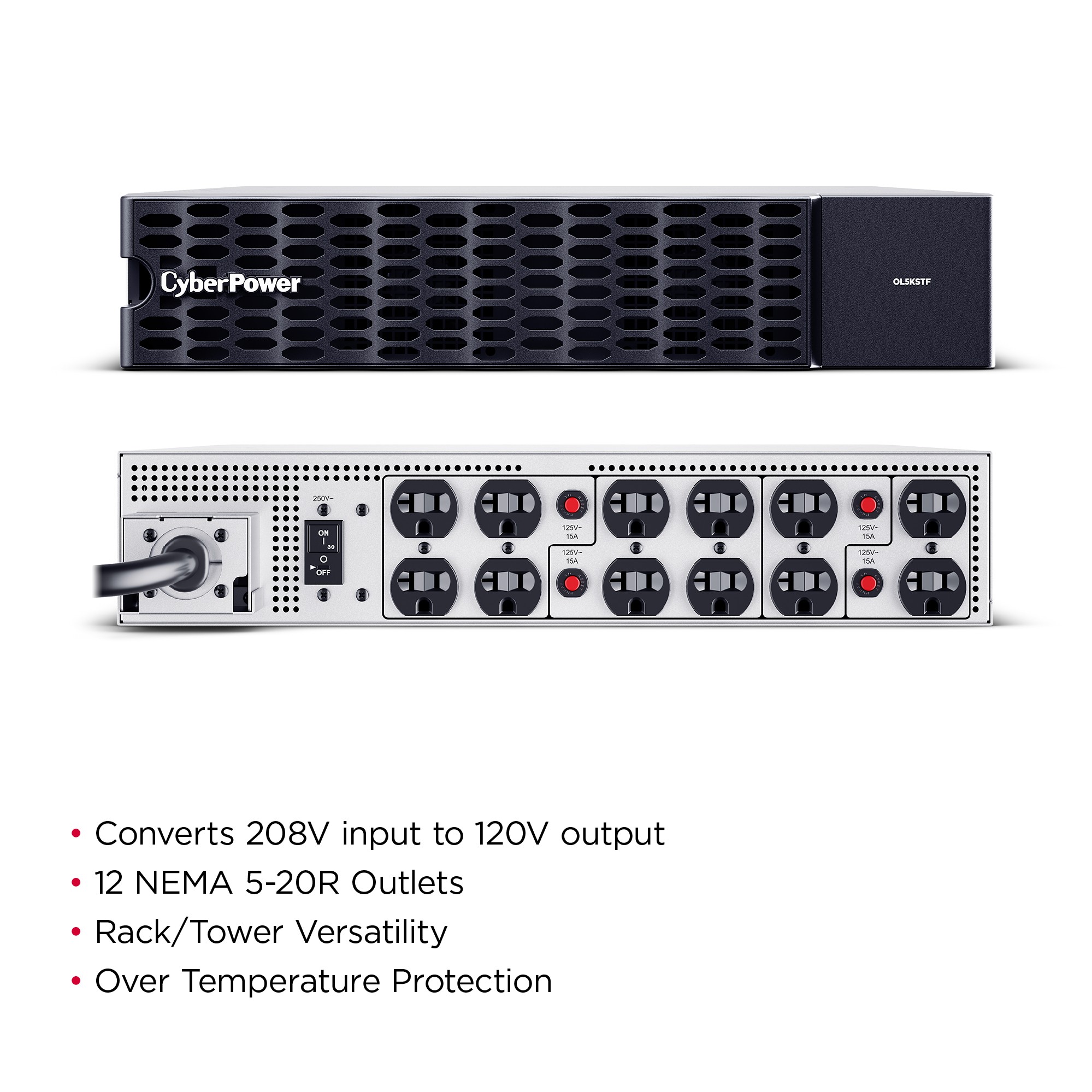 The CyberPower Smart App Online OL5KSTF rack/tower step-down isolation transformer converts 200 V to 240 V input voltage originating from utility power, a UPS, or a generator to 120 V output.