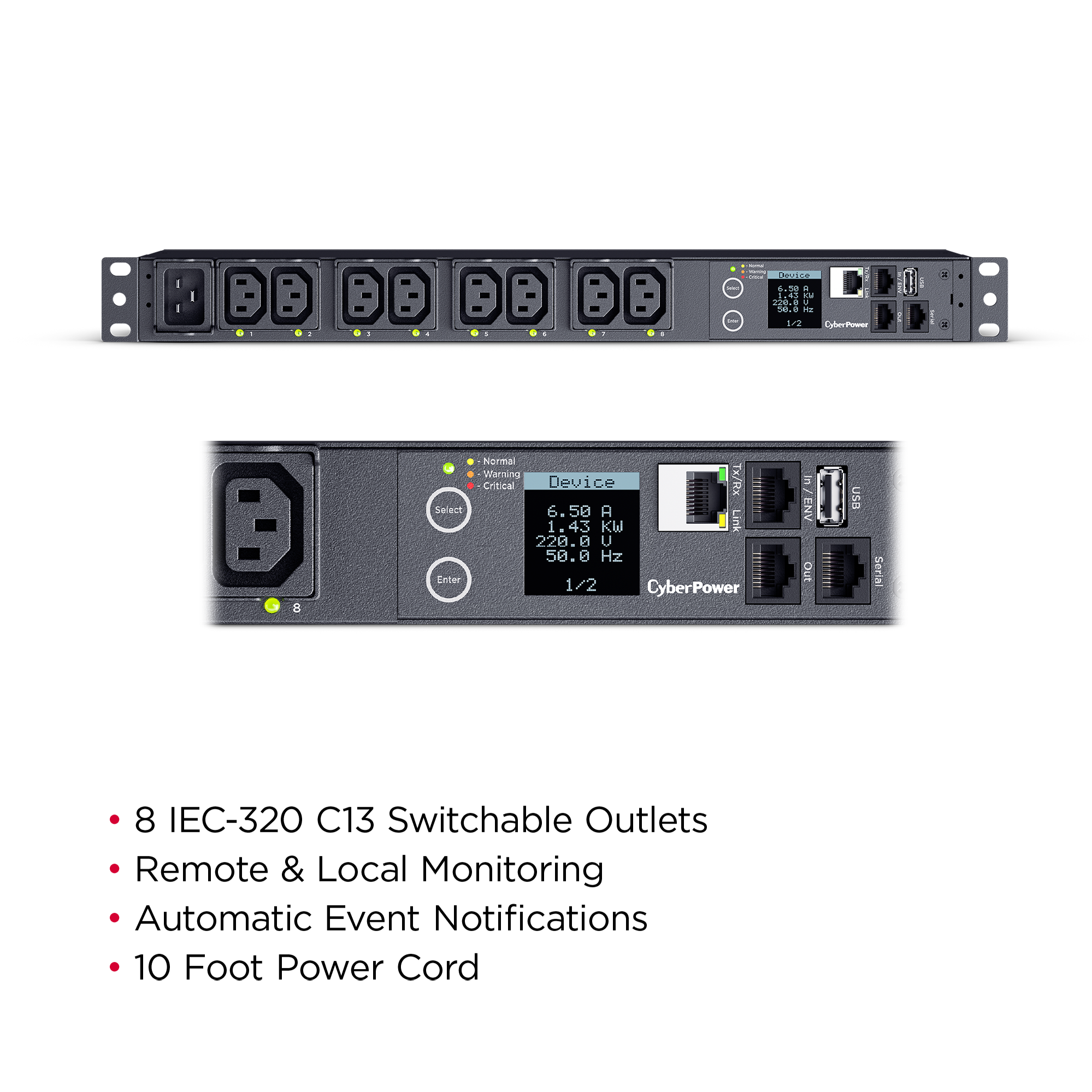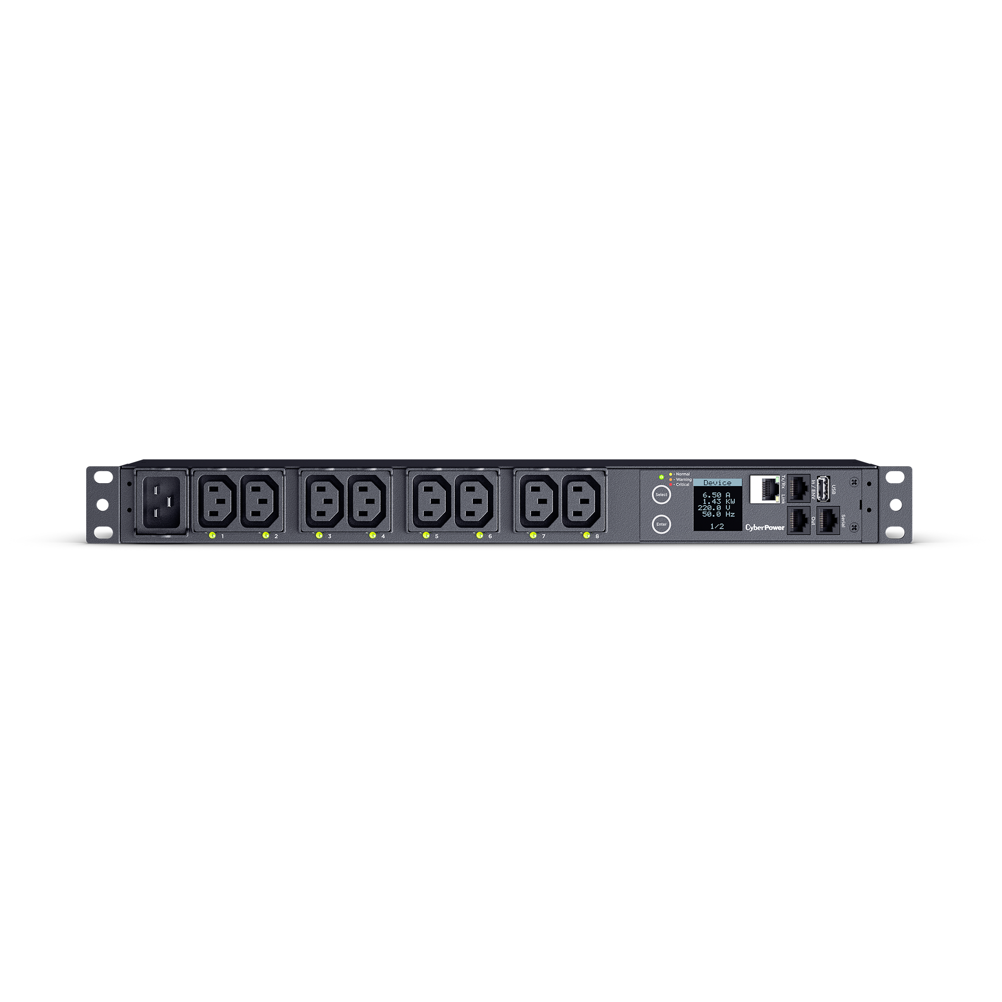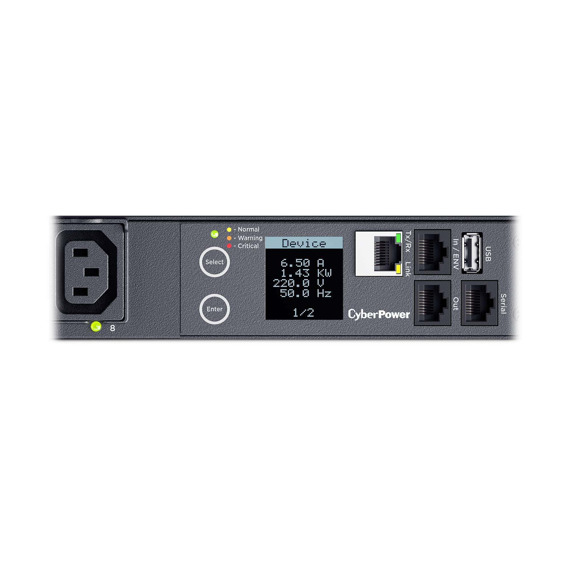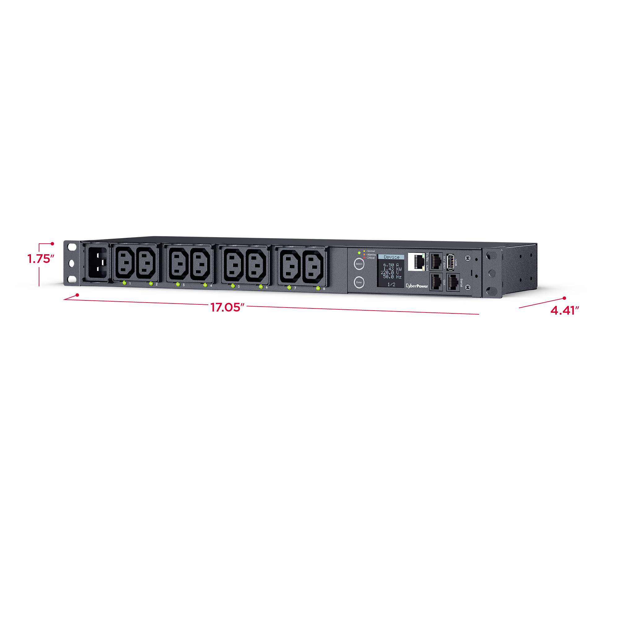 The digital display provides easy-to-read information about amperage, voltage; KW, IP address, and other vital PDU information.
