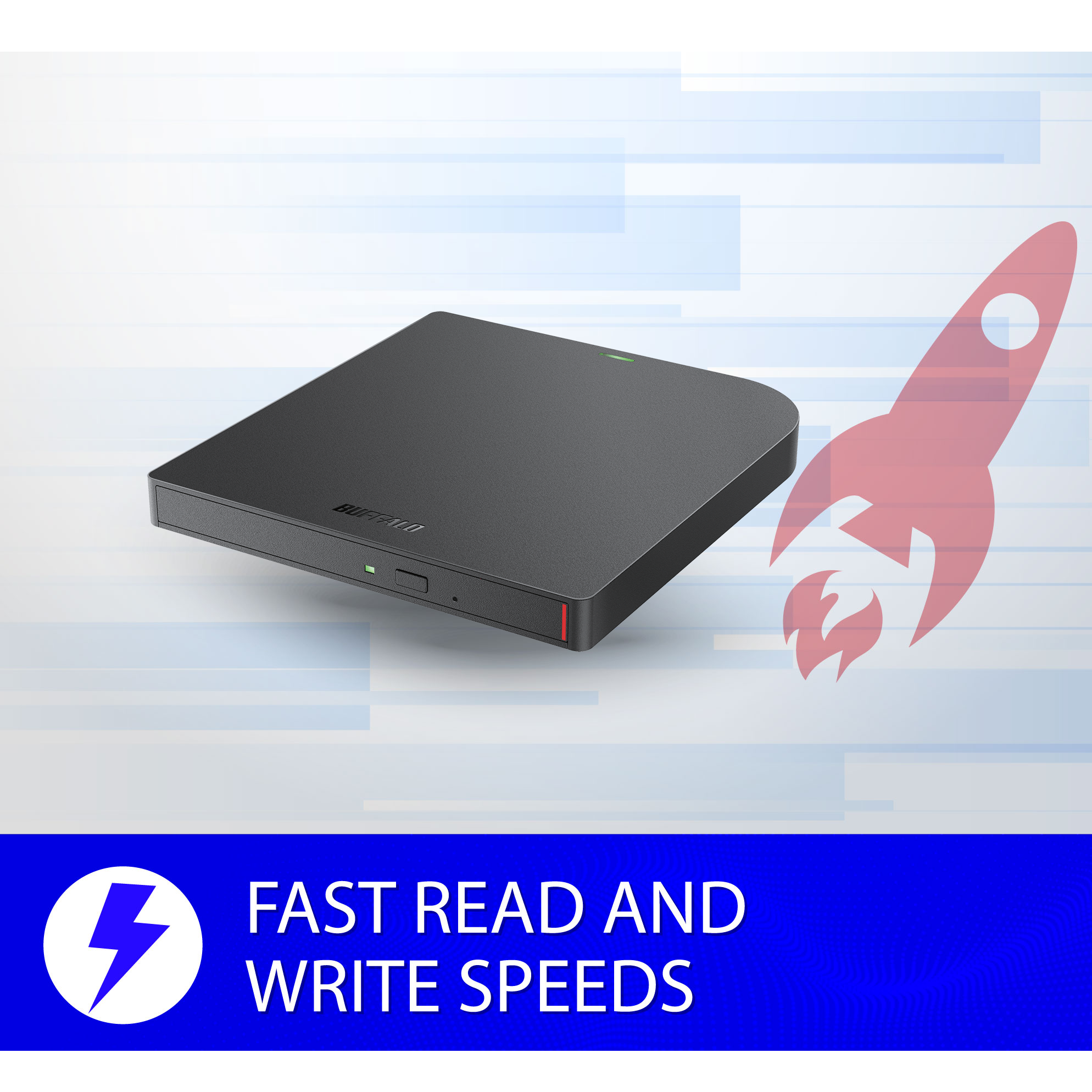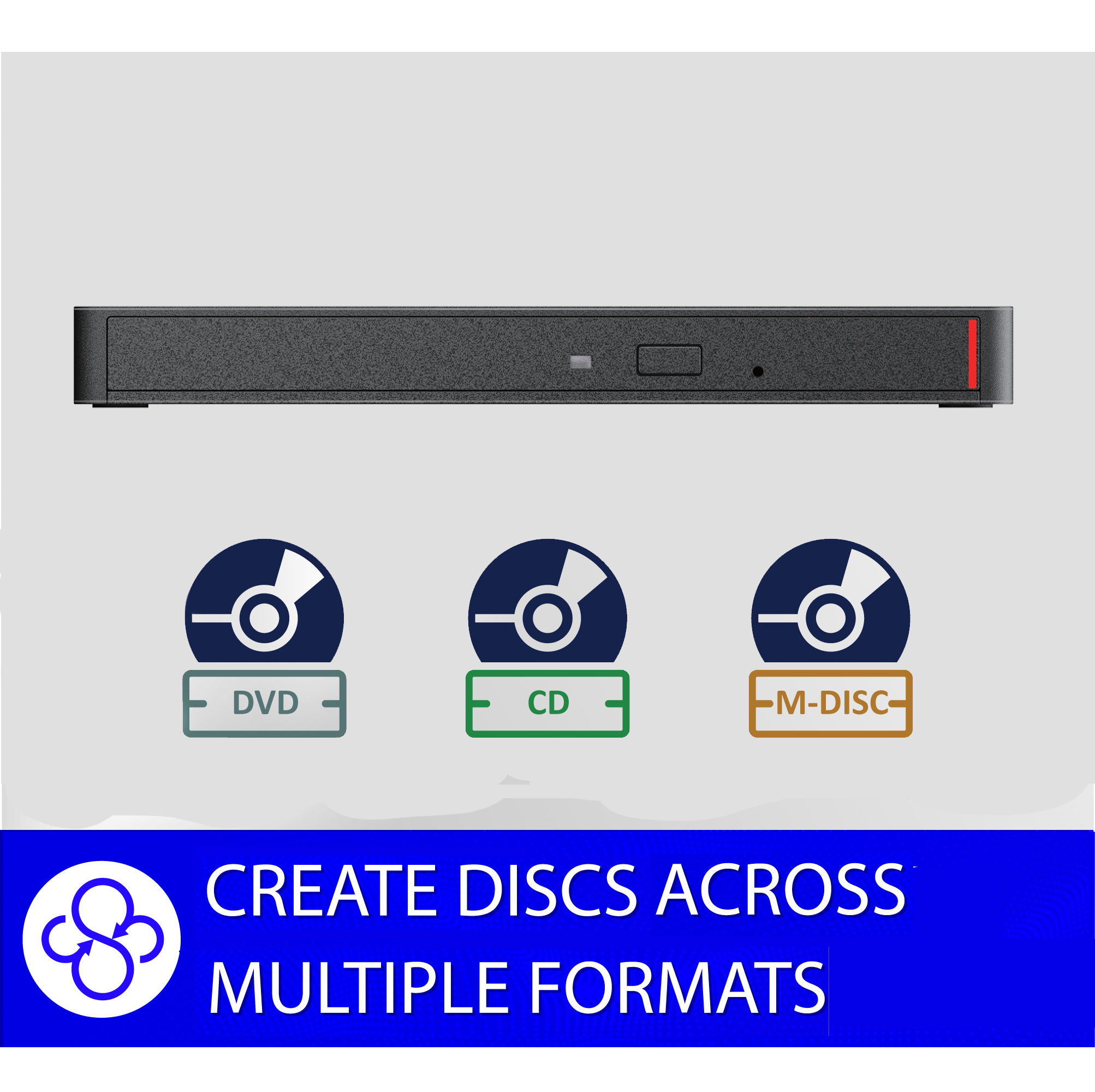 The Buffalo MediaStation 8x Portable DVD Writer is an affordable external DVD writer with M-DISC support for longer life recordings. This external DVD writer offers an ultra-slim and compact design that lends itself as an ideal travel companion for a laptop or smartbook, and is a high-quality alternative to laptop manufacturers' pricy DVD-ROM options. The MediaStation is perfect for capturing your memories and adventures while on-the-go.
