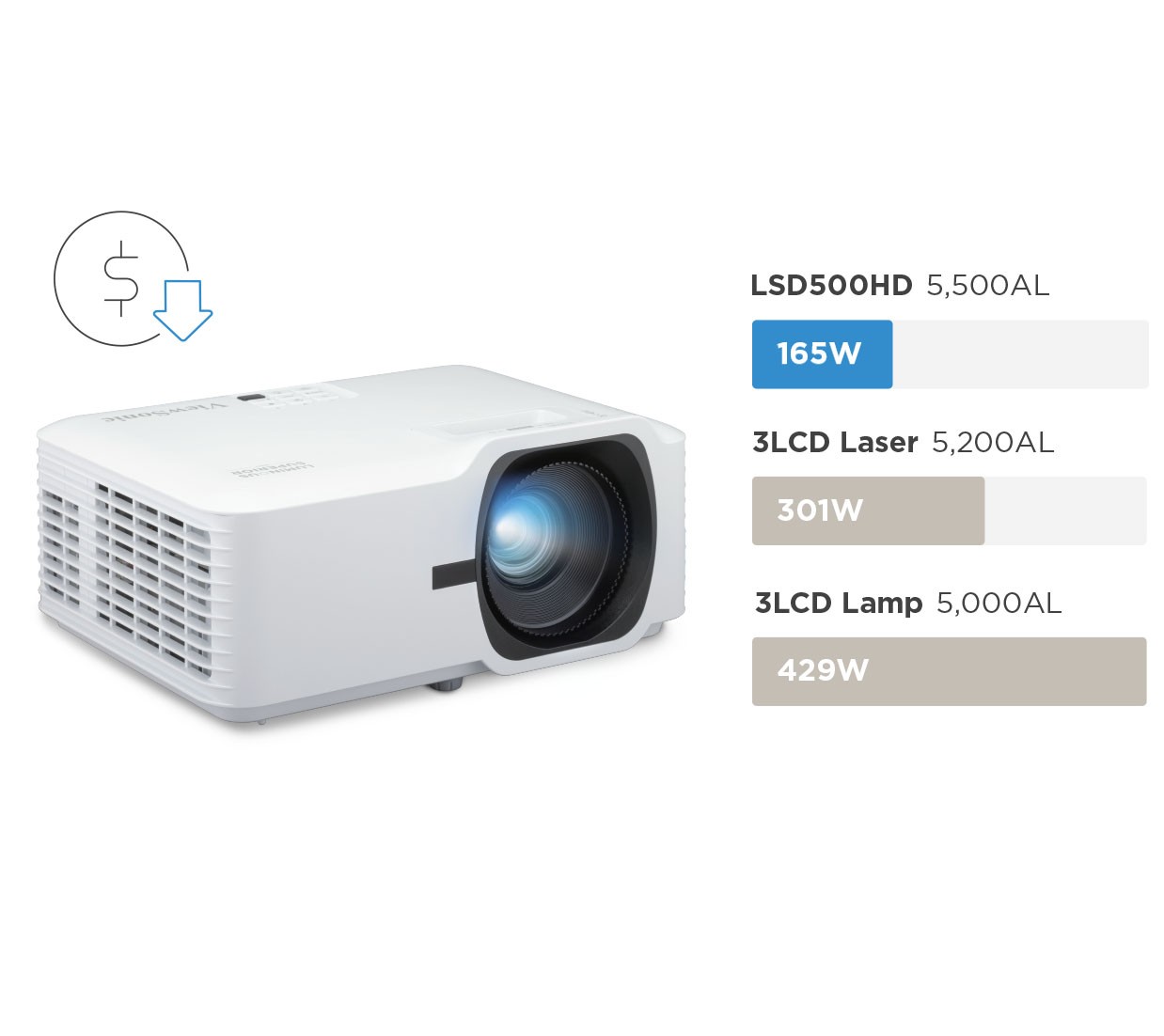 Laser phosphor technology uses up to 62% less power than a traditional lamp projector. Over a 30,000-hour lifespan, that difference in energy consumption adds up to significant savings on operating costs.