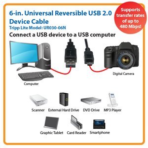 This innovative 6-inch cable is the ideal choice for maximum USB 2.0 performance for multimedia and other high-end applications. Its reversible type A connector plugs into a computer’s USB port in either direction, either right side up or upside down. Use the Mini-B connector on its other end to connect high-speed USB 2.0 devices, such as digital cameras, MP3 players and smartphones. The UR030-06N is backward compatible with USB 1.1 devices and supports transfer rates of up to 480 Mbps. It’s perfect for everyday users as well as IT professionals.