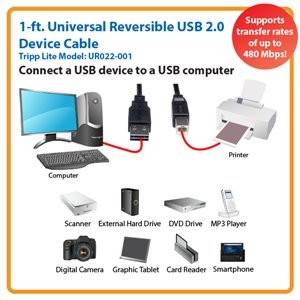 This innovative 1-foot cable is the ideal choice for maximum USB 2.0 performance for multimedia and other high-end applications. Its reversible type A connector plugs into a computer’s USB port in either direction, either right side up or upside down. Use the type B connector on its other end to connect high-speed USB 2.0 devices, such as printers, scanners, external hard drives, MP3 players, smartphones and digital cameras. The UR022-001 is backward compatible with USB 1.1 devices and supports transfer rates of up to 480 Mbps. It’s perfect for everyday users as well as IT professionals.