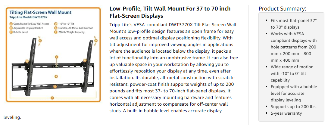 The DWT3770X adjusts to optimize viewing angles and makes the most of your display environment. It upgrades existing displays with a -10° to 0° tilt range to minimize glare, provide comfortable viewing angles and reduce fatigue. This makes it ideal for a wide range of home and business applications like airport informational displays, hotel conference rooms, point-of-sale displays, security stations, home theaters and any display application that requires angled viewing.