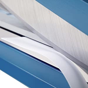 is designed for precision trimming of paper, cardstock, and matboard. It features a ground self-sharpening blade, a rotating guard to keep fingers safe, and a locking clamp to hold work securely. This German engineered cutter is ultra-precise and ideal for trimming thicker material.