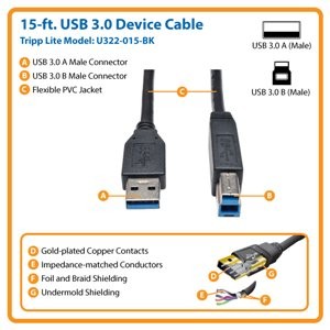 Don’t settle for inferior workmanship and performance! Tripp Lite’s U322-015-BK 15-foot USB 3.0 Device Cable is manufactured to exacting specifications with superior materials to deliver full USB 3.0 performance for multimedia and other high-end applications. For peace of mind, the U322-015-BK comes backed by a lifetime warranty and has a green, RoHS-compliant design.