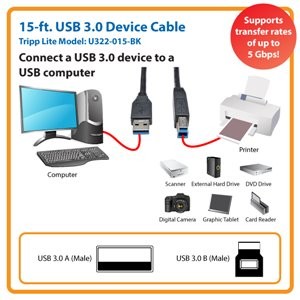 This innovative 15-foot Tripp Lite cable is the ideal choice for superior USB 3.0 performance for multimedia and other high-end applications that require fast transmission. Use it to connect computers with USB 3.0 capability to USB 3.0 devices such as printers, scanners, external hard drives and external DVD players. Sync-n-go technology minimizes wait time and optimized power efficiency means no device polling and lower active and idle power requirements. The U322-015-BK is backward compatible with USB 2.0 devices and supports transfer rates of up to 5 Gbps. It’s perfect for everyday users as well as IT professionals.