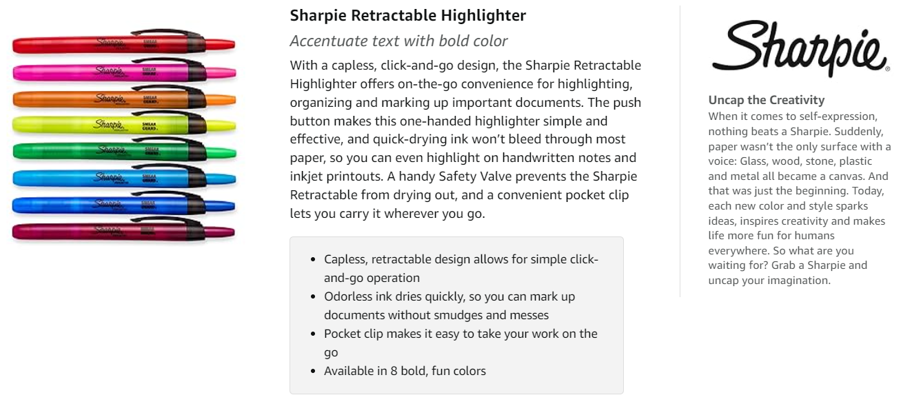 Sharpie Retractable HighlighterEasy highlighting is just a click away with the Sharpie Retractable Highlighter, which offers single-handed convenience with a capless, click-and-go design. Take notes and finish school readings with the integrated pen clip, and prevent smudging with quick-drying ink. |