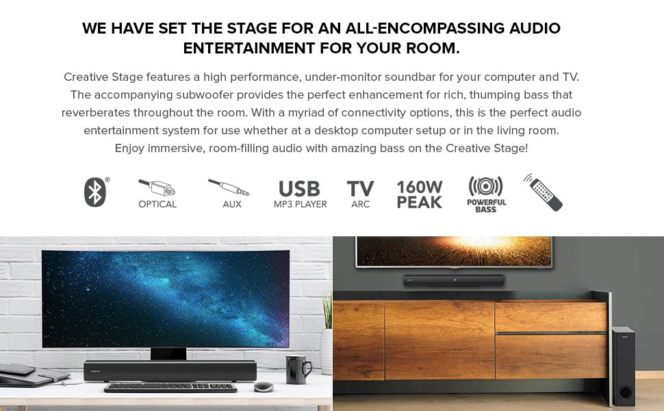 We have set the stage for an all-encompassing audio entertainment for your room. Creative Stage features a high performance, under-monitor soundbar for your computer and TV. The accompanying subwoofer provides the perfect enhancement for rich, thumping bass that reverberates throughout the room. With a myriad of connectivity options, this is the perfect audio entertainment system for use whether at a desktop computer set-up or in the living room. Enjoy immersive, room-filling audio with amazing bass on the Creative Stage!