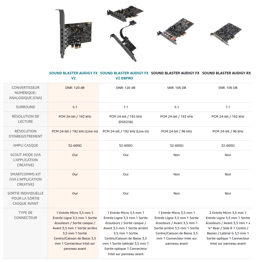 La Sound Blaster Audigy Fx V2 peut être mise à niveau en achetant une carte fille d’extension. La Sound Blaster Audigy Fx V2 DBPro est facile à configurer et dispose de fonctionnalités supplémentaires pour enrichir votre expérience audio sur PC !