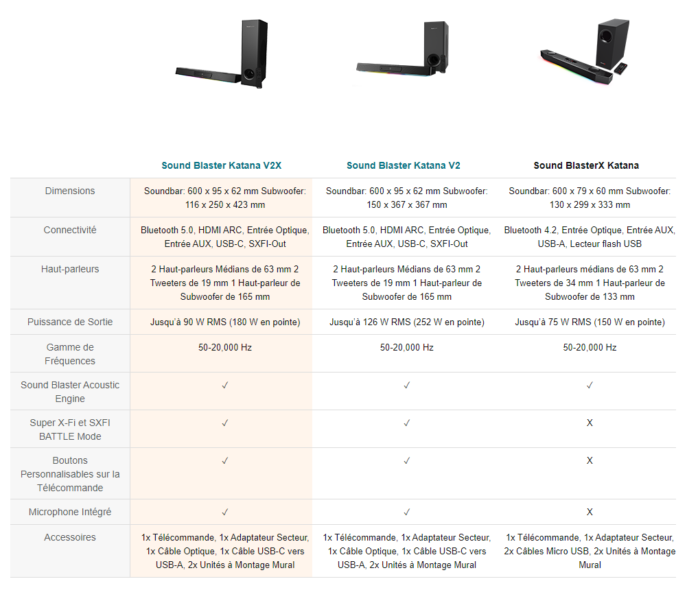 Le Sound Blaster Katana V2X est le dernier à rejoindre les rangs de nos barres de son pour jeux les plus performantes. Il offre un son puissant et toutes les fonctions les plus raffinées de ses prédécesseurs, mais avec un subwoofer beaucoup plus compact, 40 % plus petit que le Katana V2. Pour ceux qui recherchent un subwoofer discret, la Sound Blaster Katana V2X est un choix judicieux pour les pièces où l'espace est limité.