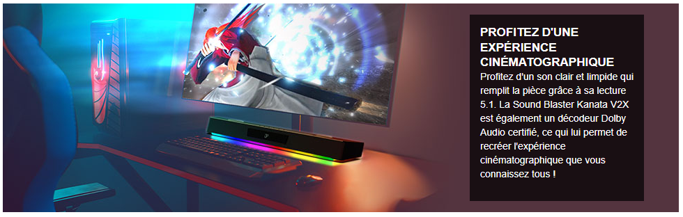 Que vous jouiez, regardiez des films ou écoutiez de la musique, donnez vie à tous vos divertissements avec la Sound Blaster Katana V2X !