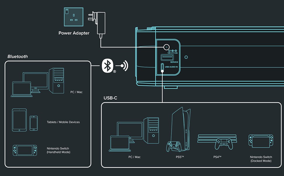 Alimentée par un adaptateur d’alimentation, la Stage SE est compatible avec USB et Bluetooth 5.3. Connectez simplement vos appareils à la barre de son à l’aide du câble USB-C vers USB-A fourni et le tour est joué ! Vous pouvez également diffuser de la musique sans fil à partir de vos périphériques mobiles grâce à la toute dernière technologie Bluetooth 5.3 et profiter de la musique à votre bureau ou en vous prélassant sur votre canapé à l’autre bout de la pièce !
